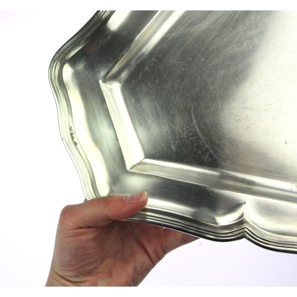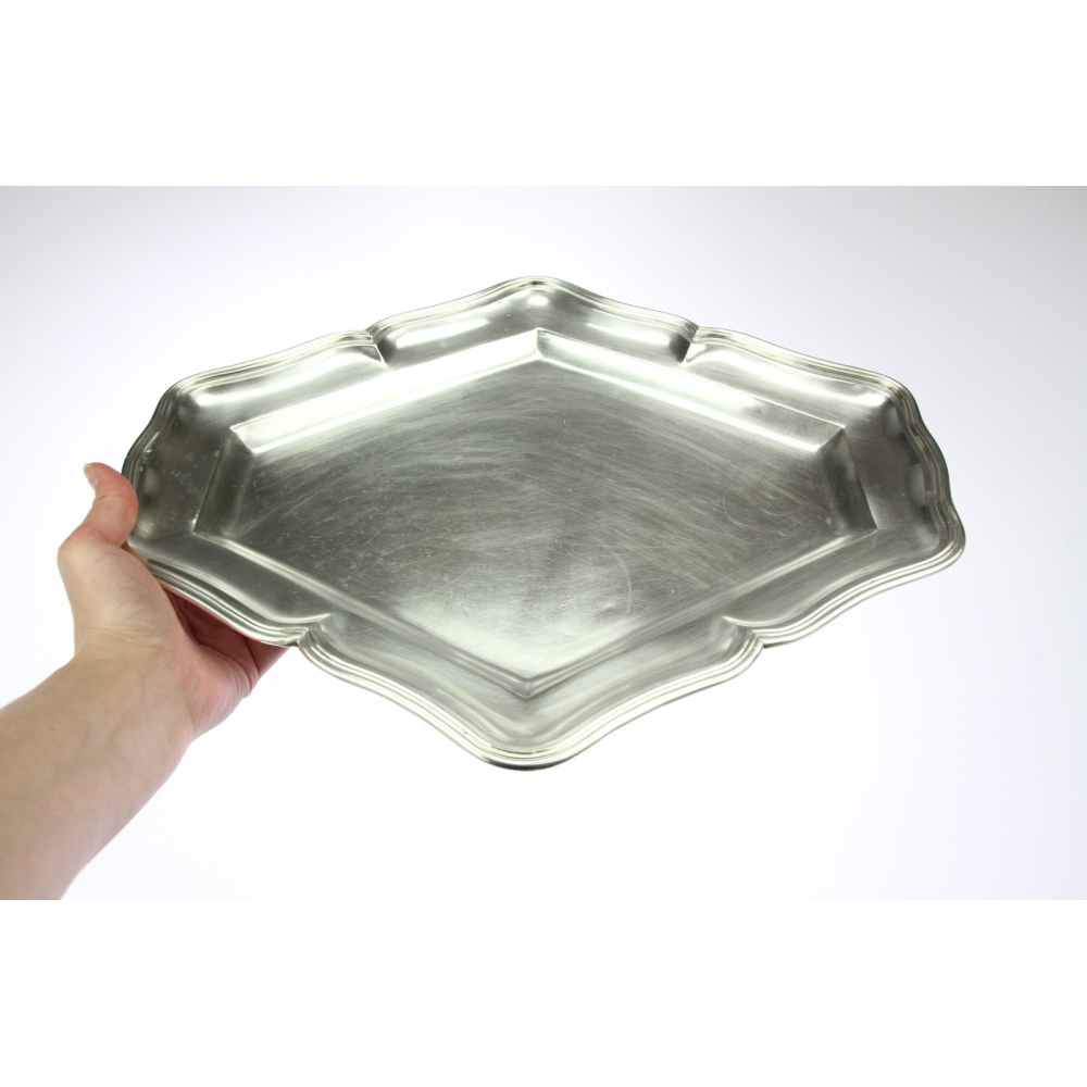 Šestiúhelný podélný servírovací tác vyrobený ze stříbra. Značeno prvorepublikovým puncem užívaným mezi lety 1929-1941 a mistrovskou značkou "SK" náležející pravděpodobně firmě S. Kohn a synové (činnou mezi lety 1887-1942).