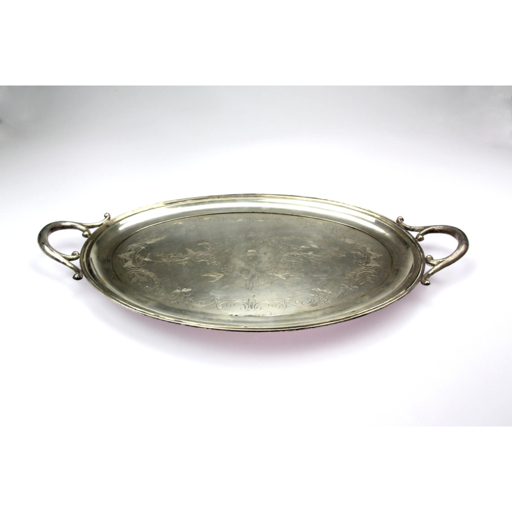 Servírovací oválný podnos se dvěma uchy zhotovený ze stříbra v období secese. Značeno rakousko-uherským puncem "Diany" s písmenem "A", byl tedy puncován ve Vídni. Střed tácu je gravírovaný, zadní strana má dřevěnou podložku.