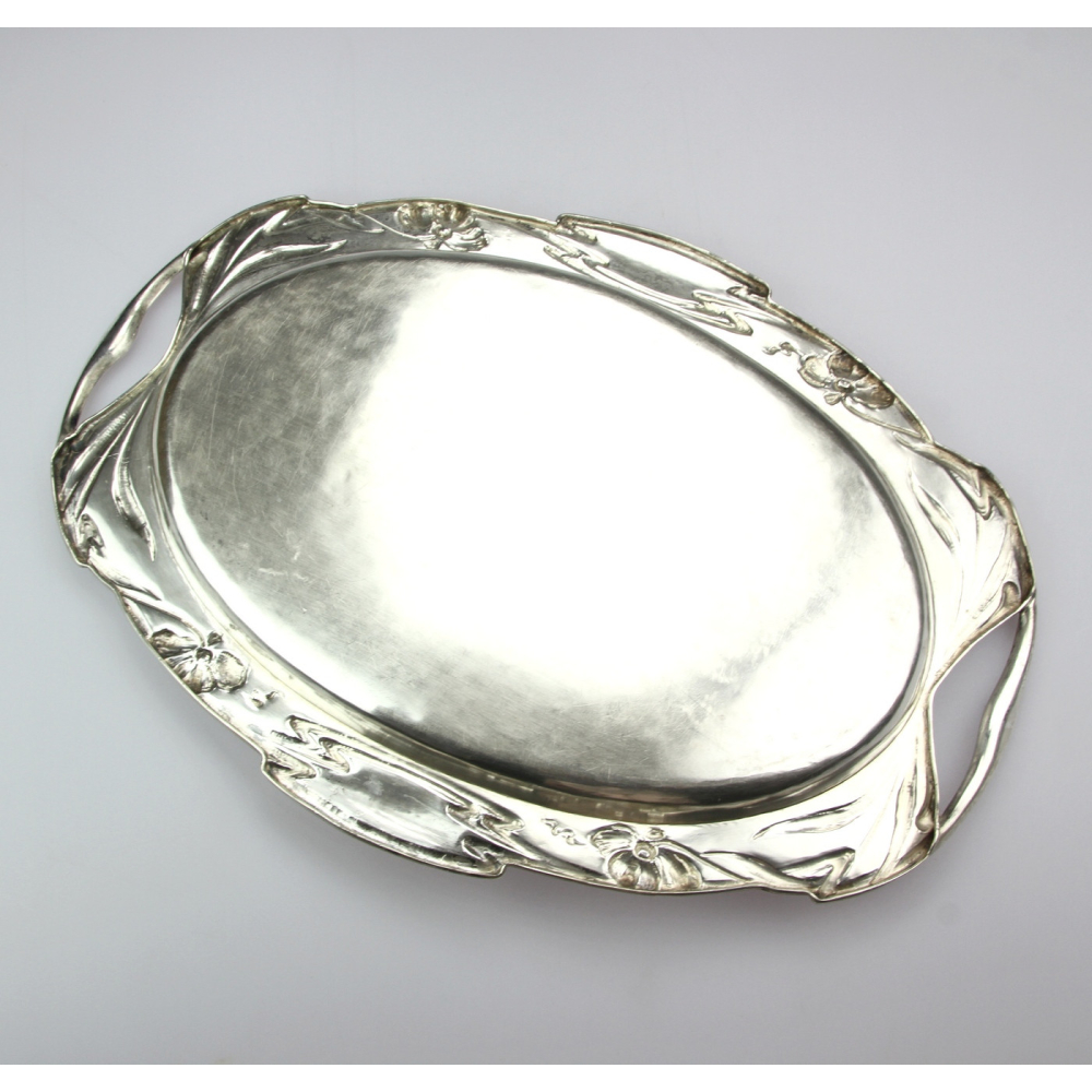 Oválný tác z období kolem roku 1900 z Vídně vyrobený ze stříbra (Ag 800/1000). Značeno rakousko-uherským puncem "Diany", písmenem "A" (Vídeň) a mistrovskou značkou "SH". Zdobeno reliéfem a gravírováním. Tác je částečně dutý (při okrajích).