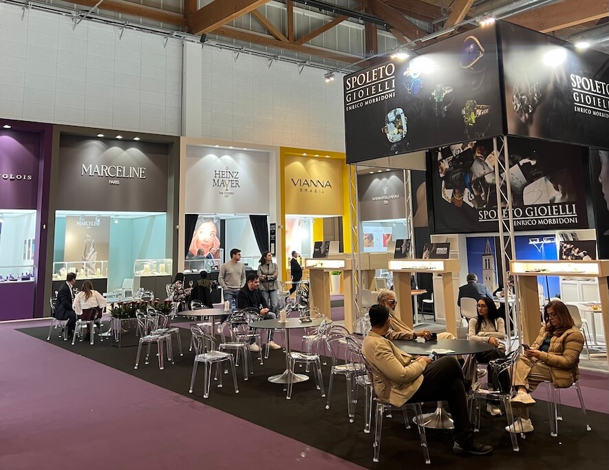Ve své novodobé podobě veletrh trvá 5 dnů a celý ho projít zabere poměrně hodně času. První hala je věnovaná exkluzivním, značkovým šperkům, vystavovatelé se zde prezentují okázalým způsobem podpořeným drahou reklamou. V dalších prostorách určených menším klenotnickým firmám, kde jsou k vidění nejnovější trendy, jsme nečekaně narazili na naše „sousedy“ z Prahy 1, šperkařství Bisaku, s kterými jsme rádi prohodili pár slov. V samostatných halách dále najdeme jednotlivé expozice prodejců zlatnických materiálů a polotovarů, nástrojů, doplňků pro prezentaci, a také drahých kamenů. Z těch mi v paměti utkvěly zejména turmalíny paraíba úchvatné neonově modrozelené barvy.