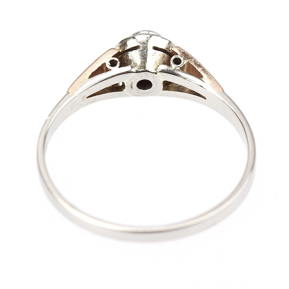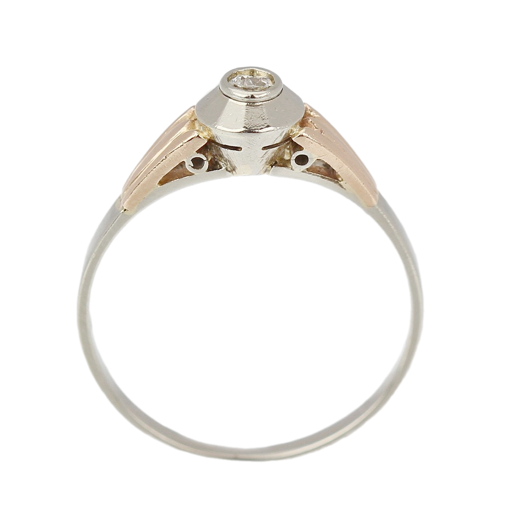 Pozdně art deco prsten vyrobený z bílého a růžového 14karátového zlata má ve fasetované korunce zasazen solitérní přírodní diamant starého briliantového brusu o váze 0,085 ct (barva G, čistota VS1).