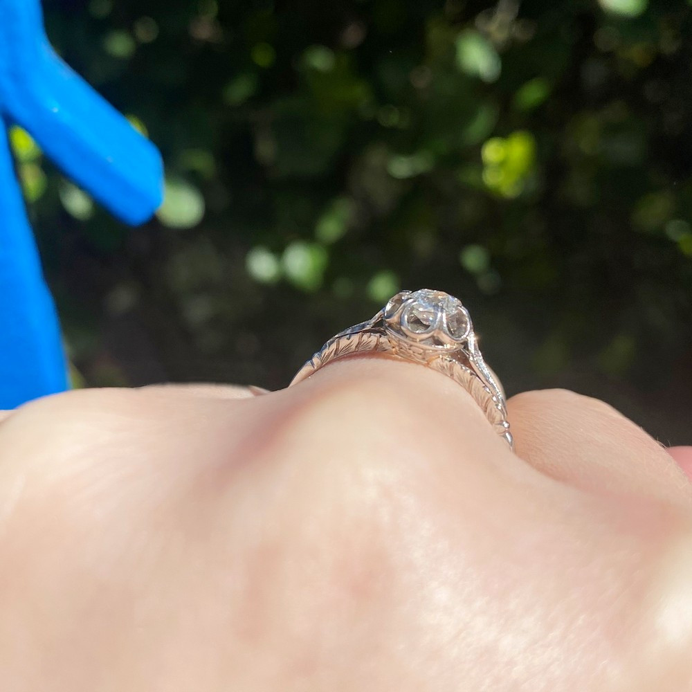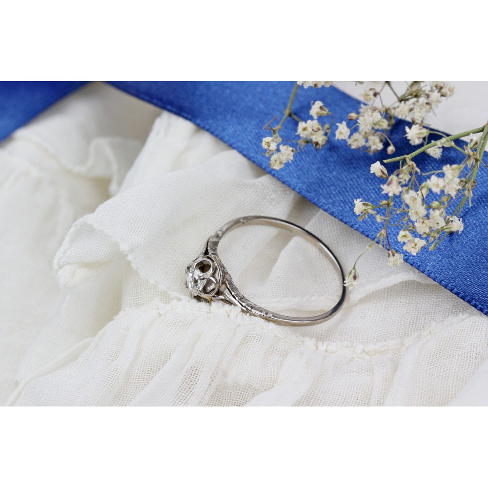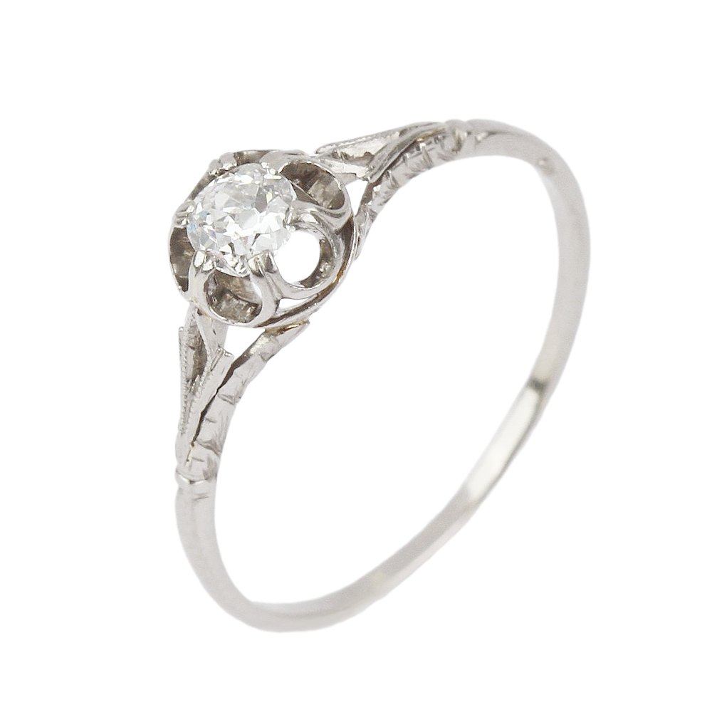 Bílozlatý 18karátový prsten s propracovanou korunkou a zdobenými ramínky. Šperku dominuje přírodní starobrusný diamant o váze 0,40 ct, barvy G–H a čistoty SI. Je zasazen do vyvýšené korunky, která je z boku i na ramínkách zdobena technikami prořezávání, millegrain a gravírováním s motivy květin a lístků.