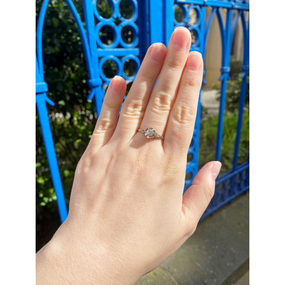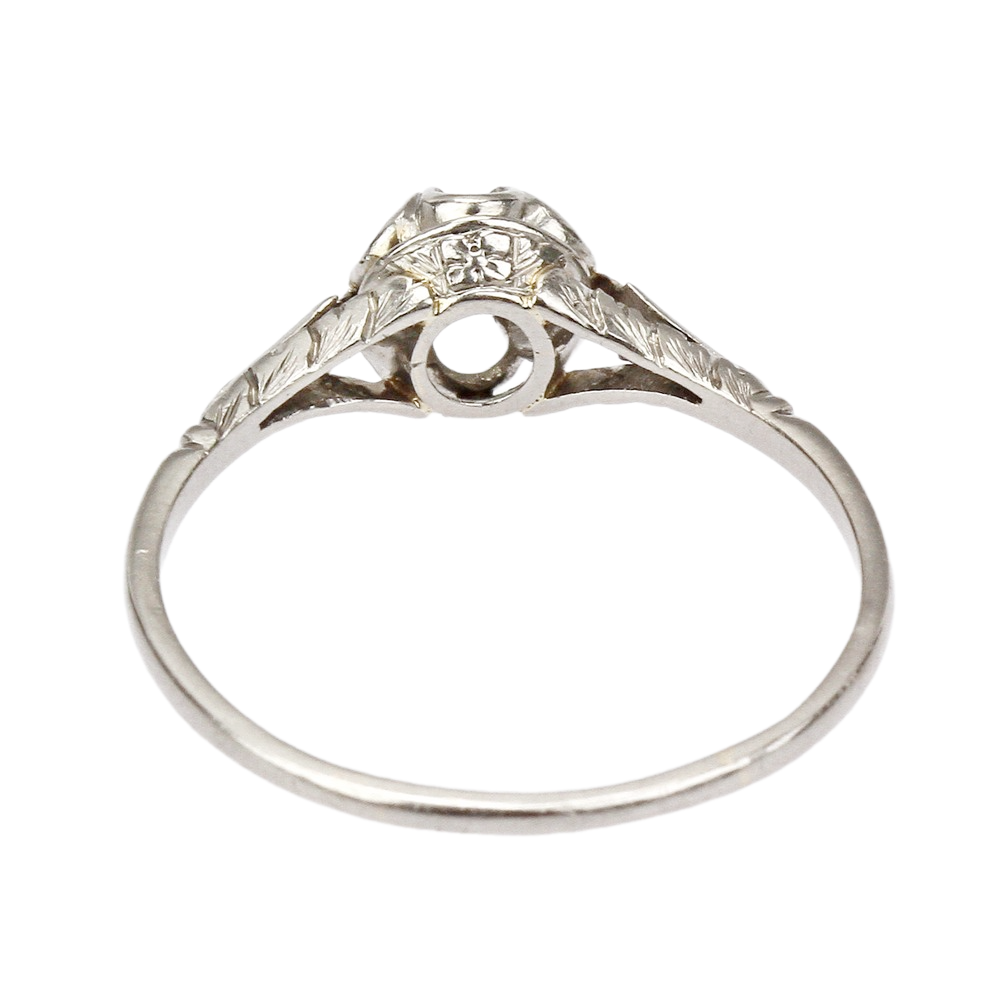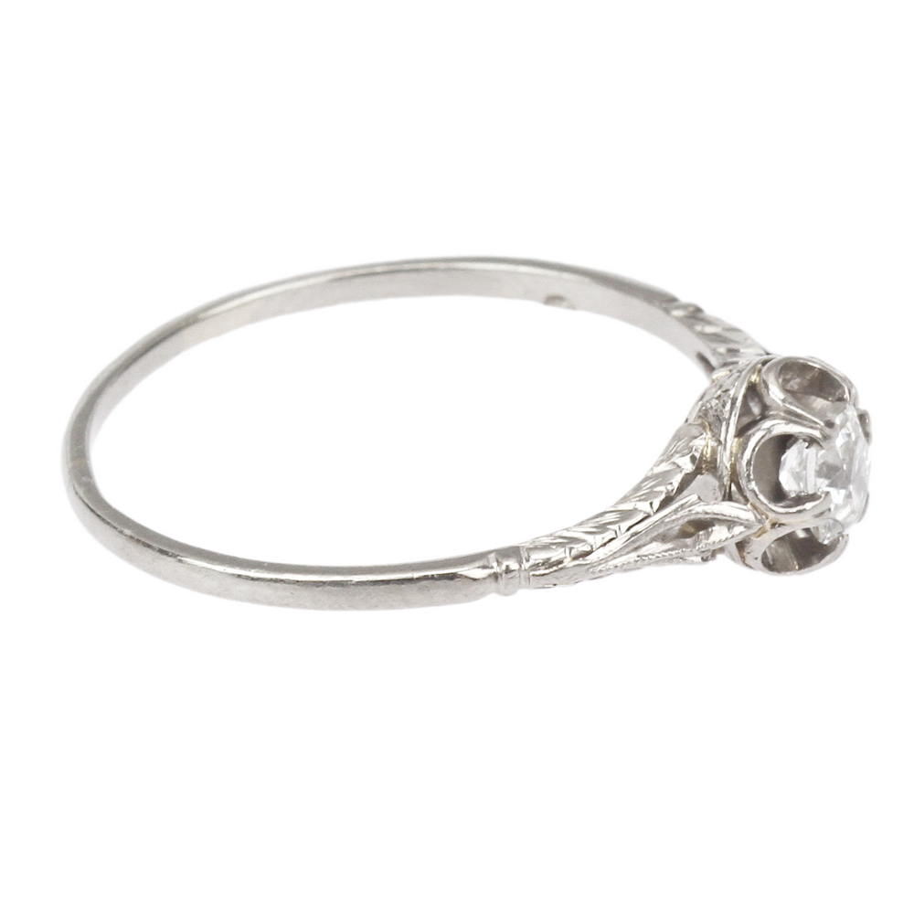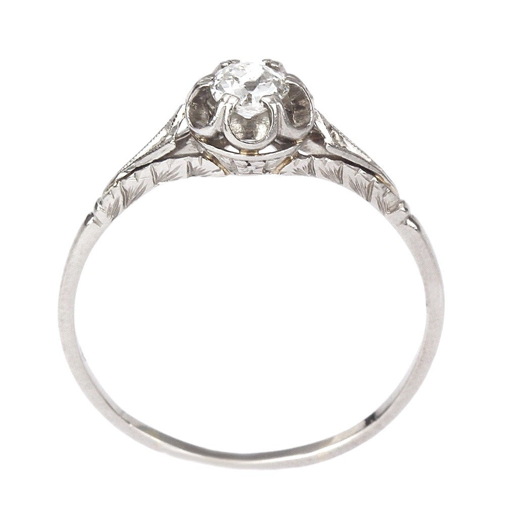Bílozlatý 18karátový prsten s propracovanou korunkou a zdobenými ramínky. Šperku dominuje přírodní starobrusný diamant o váze 0,40 ct, barvy G–H a čistoty SI. Je zasazen do vyvýšené korunky, která je z boku i na ramínkách zdobena technikami prořezávání, millegrain a gravírováním s motivy květin a lístků.