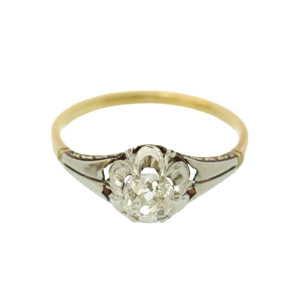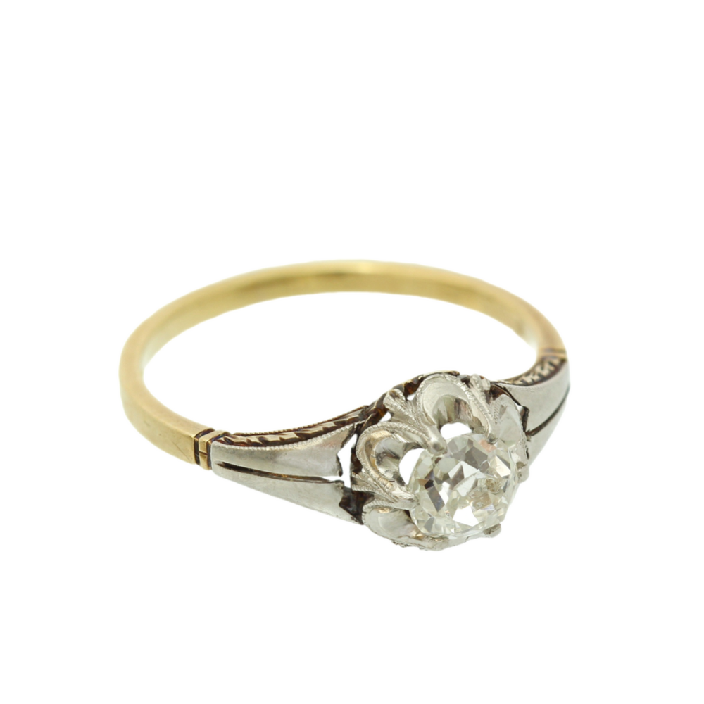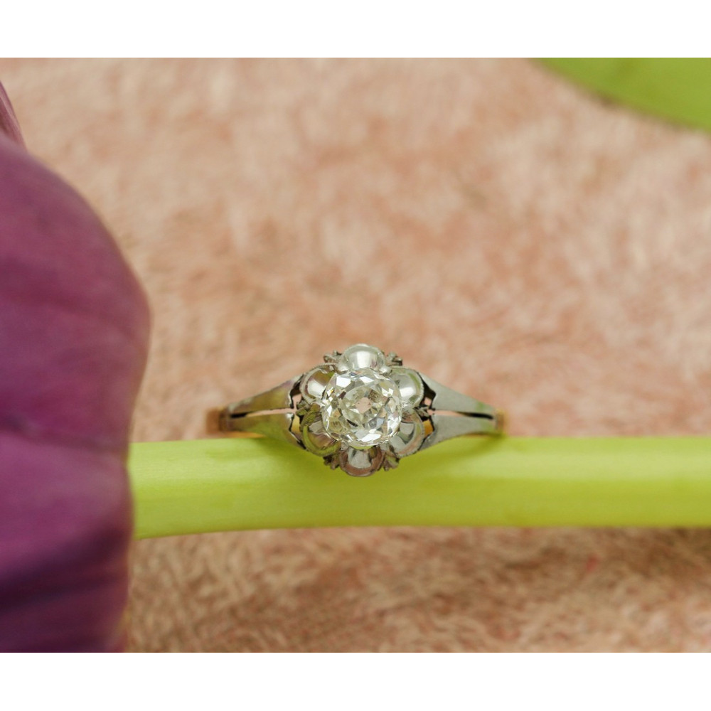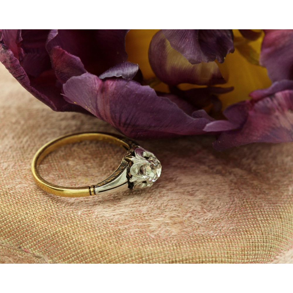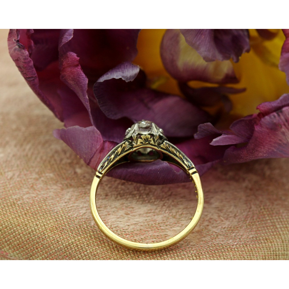 Zlatý 18karátový prstýnek s postříbřenou korunkou a ramínky. Do centra prstenu klenotník vsadil přírodní diamant starého brusu o váze 0,52 ct, barvy I a čistoty SI2. Je zasazen ve vyvýšené korunce tvaru květiny, z boku zdobené zrnkovou technikou millegrain a gravírováním s motivy květin a lístečků.