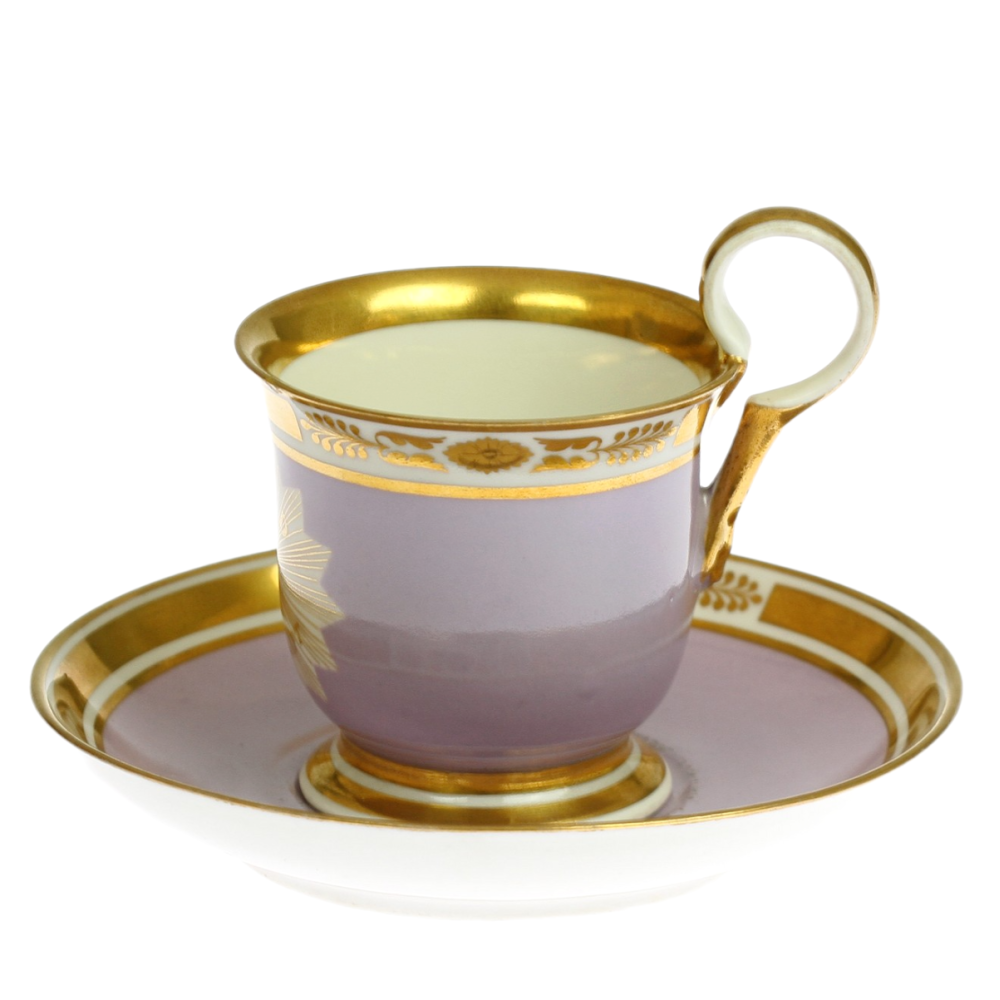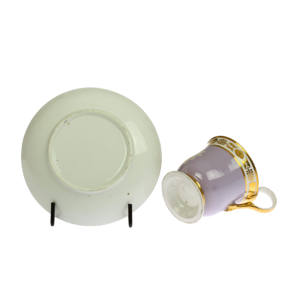 Hand-painted purple and white porcelain cup and saucer were made between 1828 and 1838 by the Imperial Porcelain Manufactory in Vienna. Decorated with gold coating and a floral motif in the centre of the saucer. The front of the cup is decorated with a star with the inscription 'SND nie unsere FREUNDSCHAFT' meaning "Our friendship will never end". The everlasting flower on the saucer only enhances the meaning. On the underside of both pieces we find the mark of the Vienna porcelain factory.