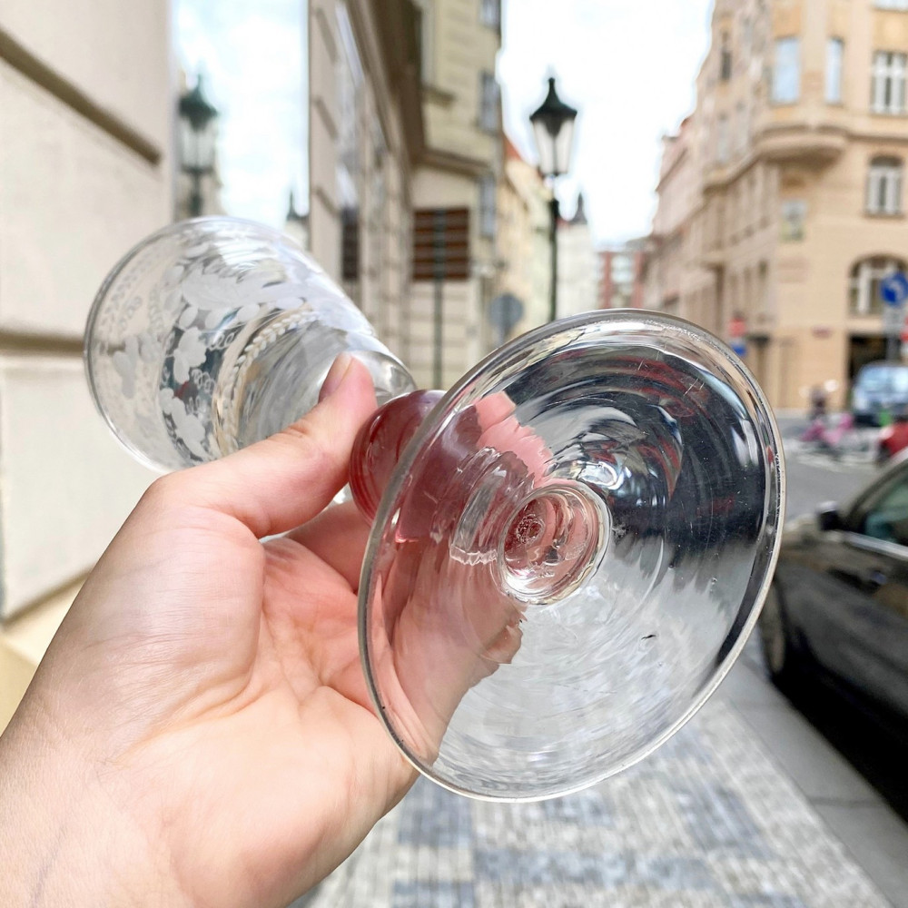 Technologically similar vessels made of clear colourless glass and with ruby threads were produced around 1700, for example in South Bohemia in the Vimperk region (see the last photograph, taken from the publication Černovská Jana, Mergl Jan, Collector - Lann's glass collection, Museum of Decorative Arts in Prague, 2022, p. 74).