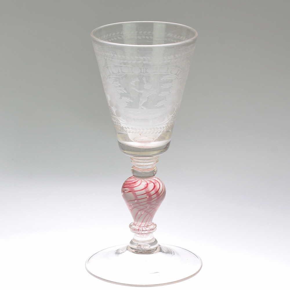 Glass goblet from the Baroque time period, from the first quarter of the 18th century from Central Europe. It is a type of goblet with a funnel-shaped dome and a balustraded leg with sealed ruby threads. The body of the vessel is cut with an allegorical theme of a cupid releasing a winged heart and a vine.