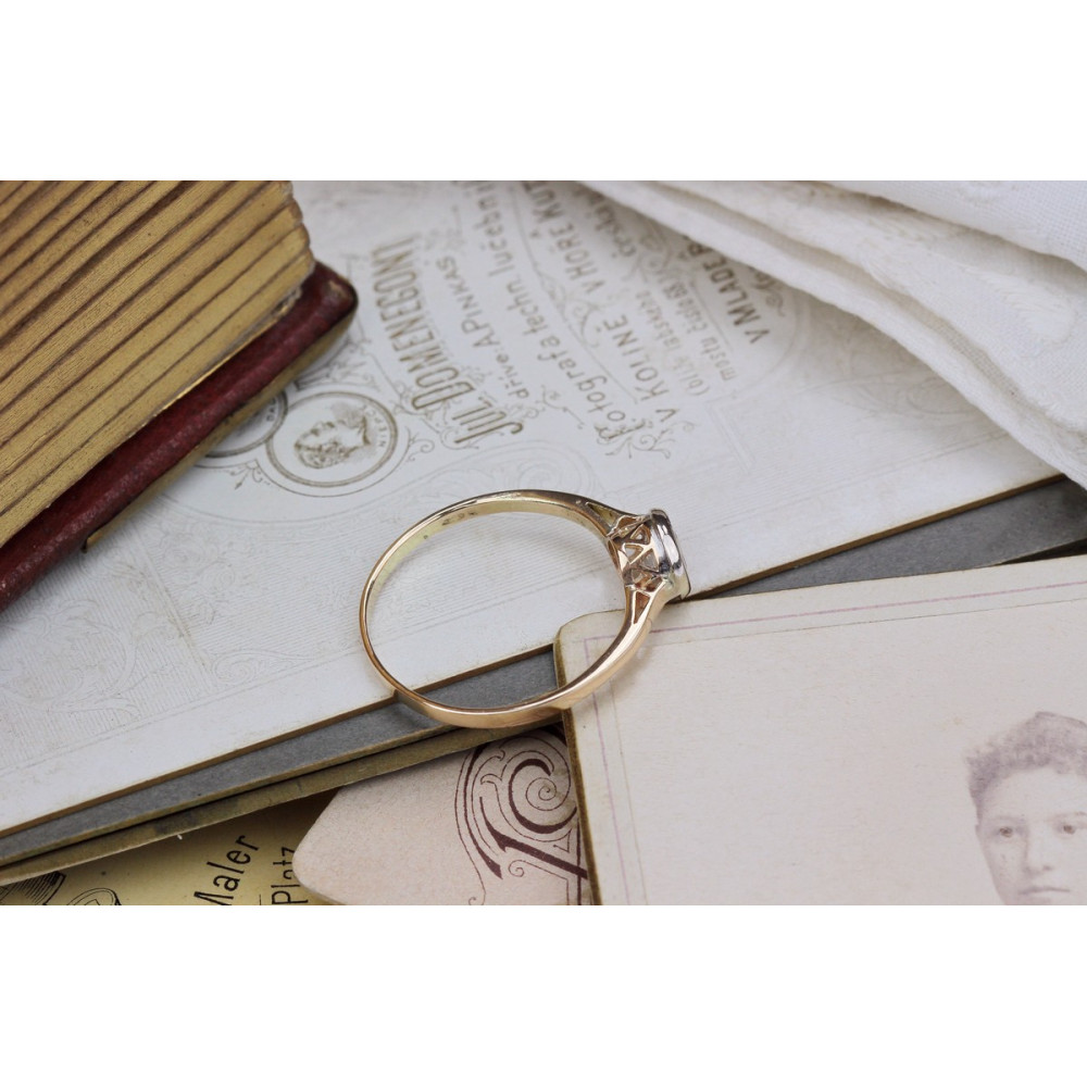Ring with a solitaire natural diamond of old cut weighing 0.75 ct, G color and VVS clarity. The material is Austro-Hungarian rosey 14k gold (580/1000), the diamond is set in a white gold bezel setting. Hallmarked in Vienna before 1922.