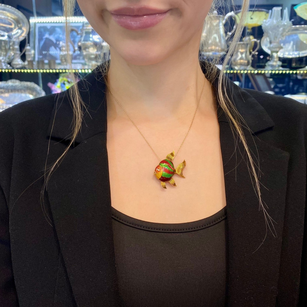 Fish-shaped brooch made of 18k yellow gold with colored enamel and a diamond eye – natural single cut diamond weighing 0.02 ct, color G and clarity VS. Italian work. The brooch is fastened by two vertical pins.