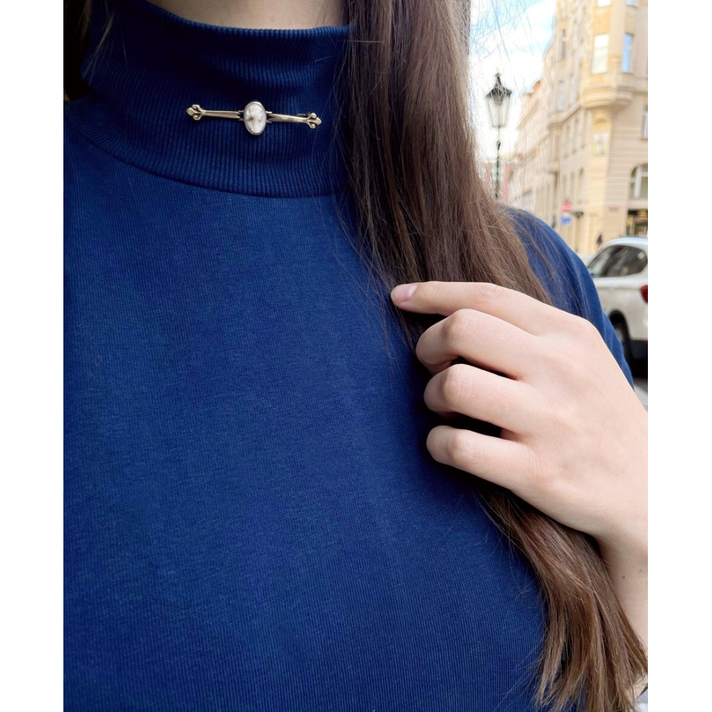 An elegant rectangular bar brooch made in the second quarter of the 20th century by the Canadian jewelry and silversmith company Birks (active since 1879). Crafted in 14k yellow gold, its front is partially enameled and set with five natural seed pearls. The pin is fitted with a safety clasp.