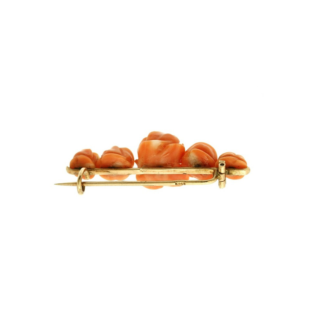 A brooch consisting of five roses hand-carved from natural sea coral. The roses are arranged in a single row on a base made of 14k yellow gold. The brooch is stamped the Czechoslovak "lion" hallmark used between 1929 and 1949.