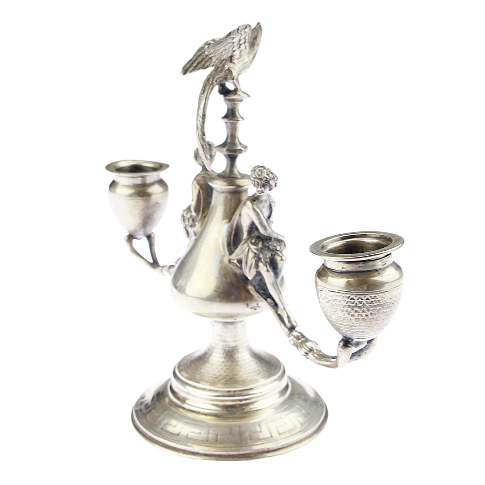 This two-arm silver candlestick from the Austro-Hungarian period is decorated with detailed figural motifs and a three-dimensional sculpture of the mythical phoenix bird, symbolizing rebirth. On the base is a detailed hand engraving in the form of a meander pattern. Marked with the hallmark “Diana” with the letter “A” (hallmarked in Vienna).