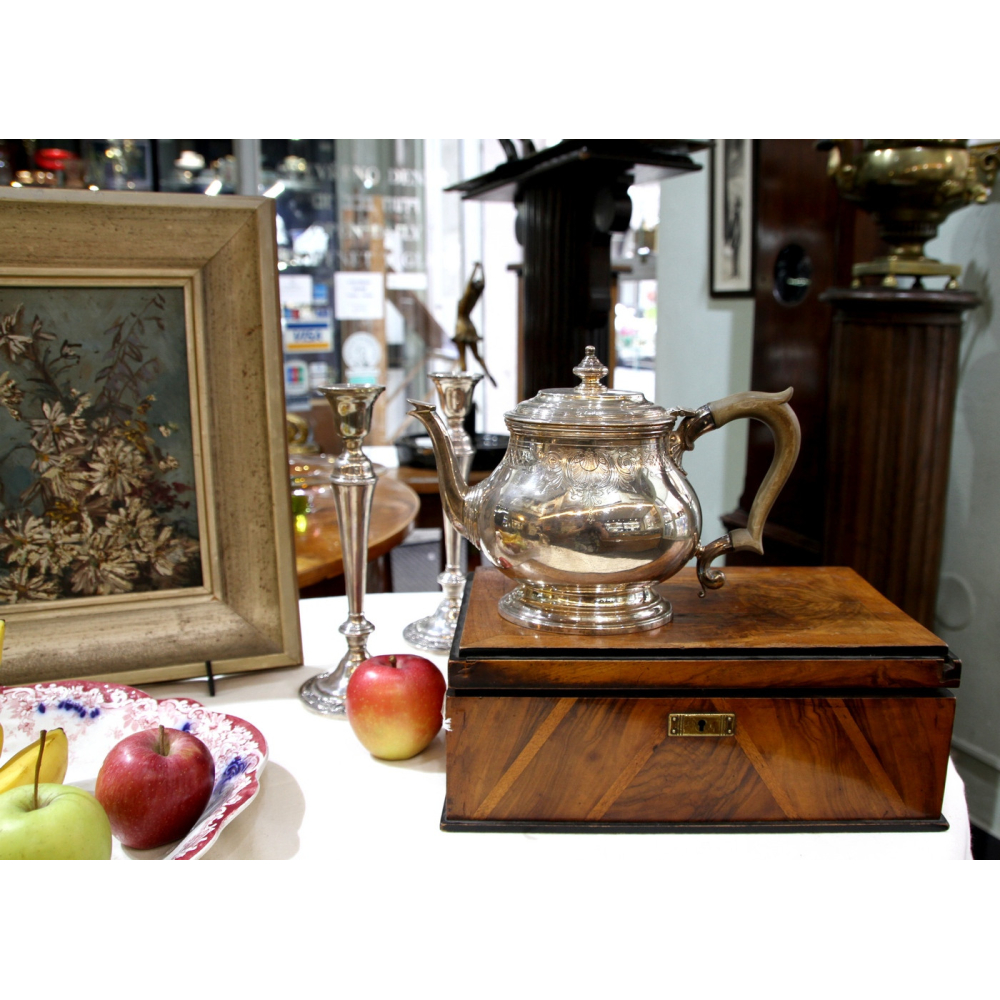 Teapot made of sterling silver with a wooden handle from 1953 in Atkin Brothers Co. in Sheffield, England. Beautiful arts and crafts.