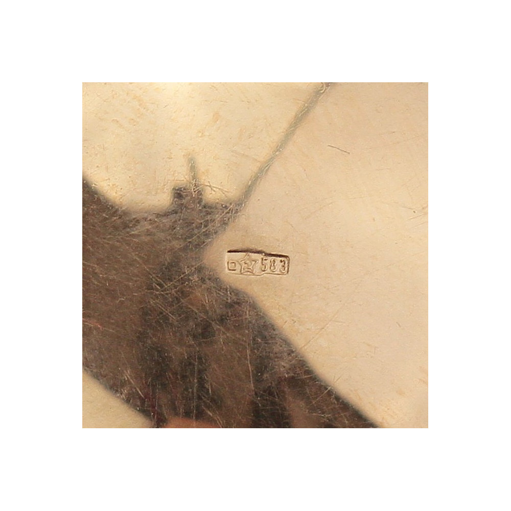 Hunting jewellery, pendant, made of sculpted oak branches in 14k yellow gold. In the centre of the pendant are two grandels (roe deer teeth). Several parts are gilded with rose gold. The bail has been newly hallmarked with the contemporary Czech “swan” hallmark.