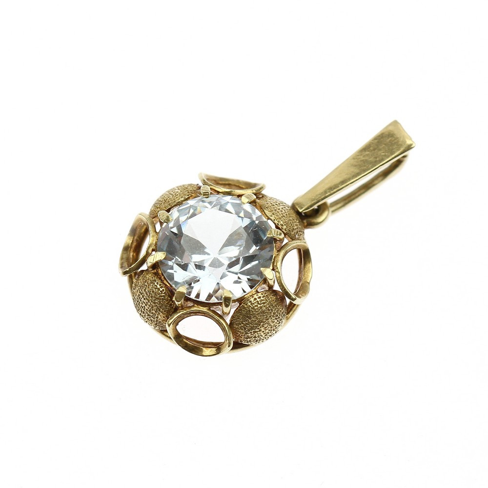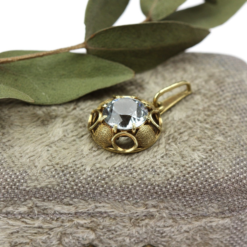 Imitation turquoise set in a 14k yellow gold frame with a loop. The lenght of the pendant with the loop is 2 cm.