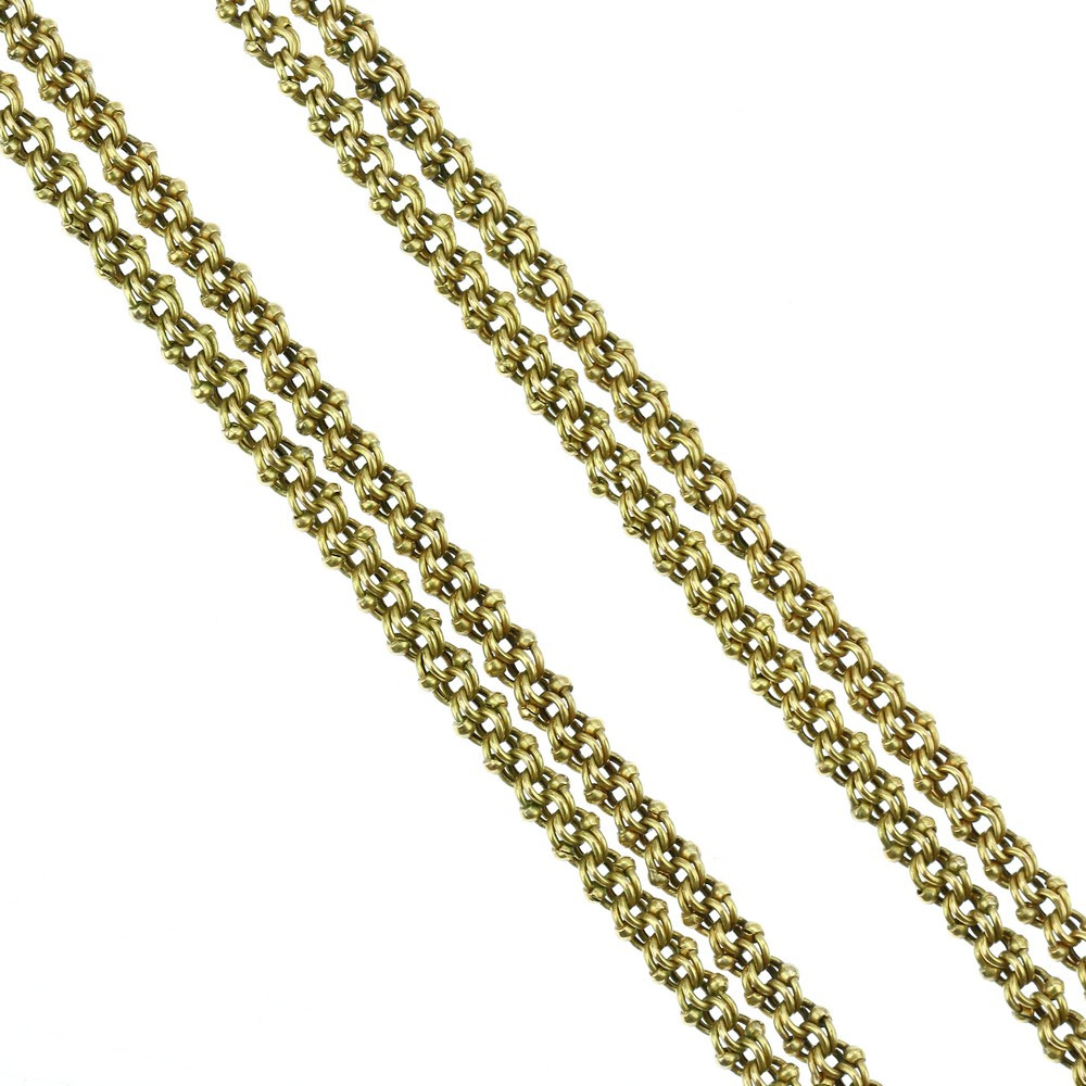 A 148 cm long chain made of 14k yellow gold (580/1000). Marked with the Austro-Hungarian hallmark "fox" with the letter "C", indicating the Prague Assay Office.