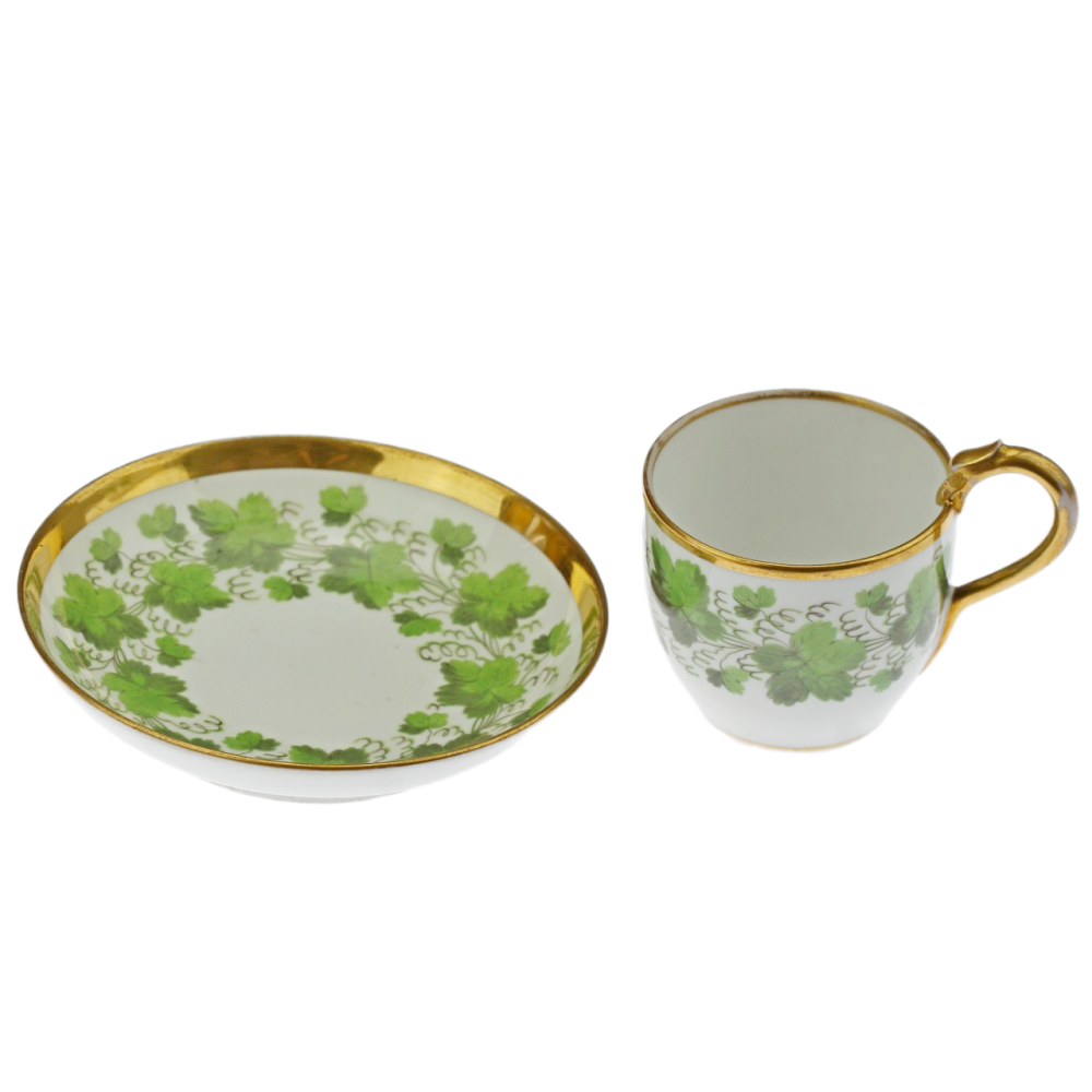Porcelain cup and saucer with hand painted motif of vine leaves. Marked by the porcelain manufactory in Horní Slavkov, probably around 1815 (the date marking is missing here, which was used only later from 1817 (or 1819).