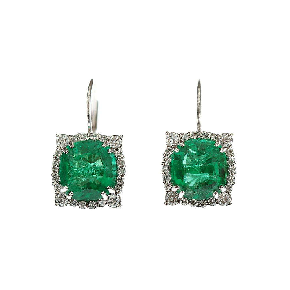 These earrings, made of 14k white gold, are set with unique emeralds from Zambia with a total weight of 5.21 ct (2.61 ct and 2.60 ct). The emeralds are surrounded by 8 natural round cut diamonds with a total weight of 0.264 ct and 36 natural round cut diamonds with a total weight of 0.205 ct, color G–H and clarity VVS–VS.