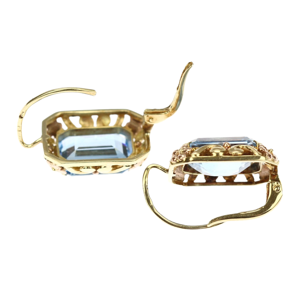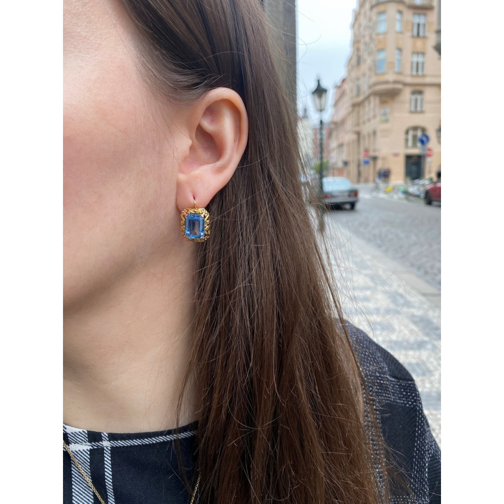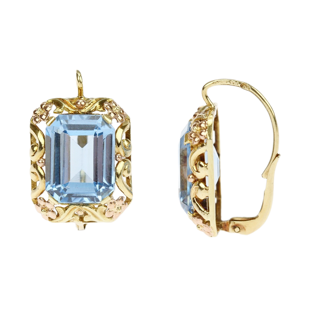 Earrings made in the 1940s in Czechoslovakia from 14k yellow gold. Set at the center of the piece are light blue synthetic spinels, surrounded by a wide frame composed of leaves and flowers. Fastened with a classic ladies’ clasp.