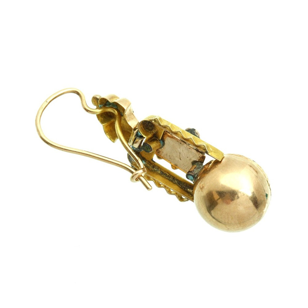 Dangle earrings crafted from a combination of rose and yellow 14k gold in the last third of the 19th century. They are adorned with engravings, natural freshwater pearls, and black enamel. The hook is stamped with an Austro-Hungarian hallmark used after 1872. Given their age, the earrings are in very good condition with no dents; only the black enamel is missing in places.