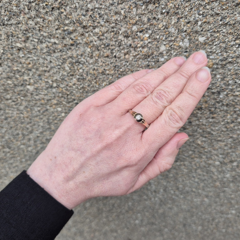 This ring, crafted from 14k white and yellow gold, dates from the 1930s–1940s in Czechoslovakia. It is marked with "lion" hallmark (used between 1929 and 1949), the fineness mark "585," and a less legible maker's mark. It is set with a natural old cut diamond weighing 0.25 ct, color F, and clarity VS.