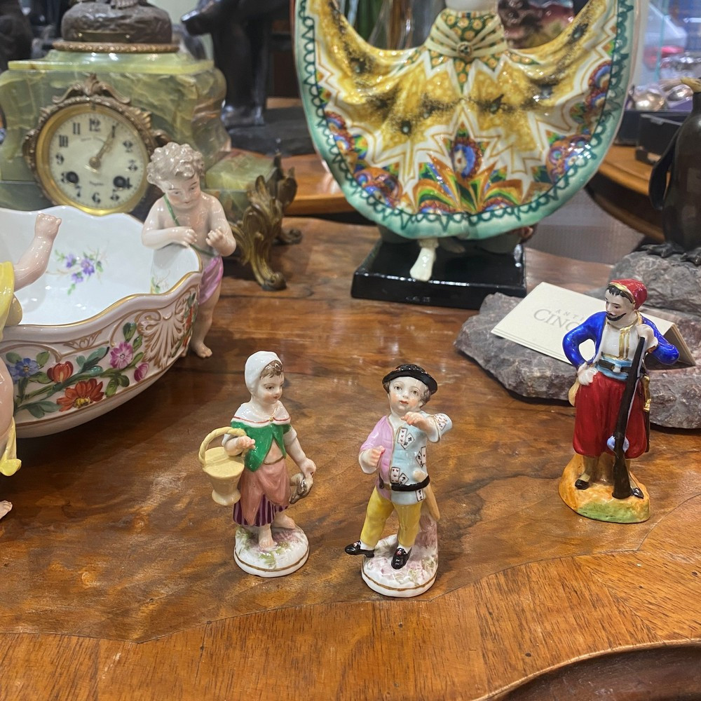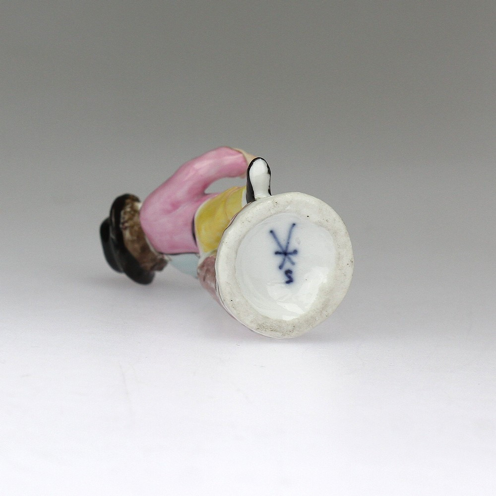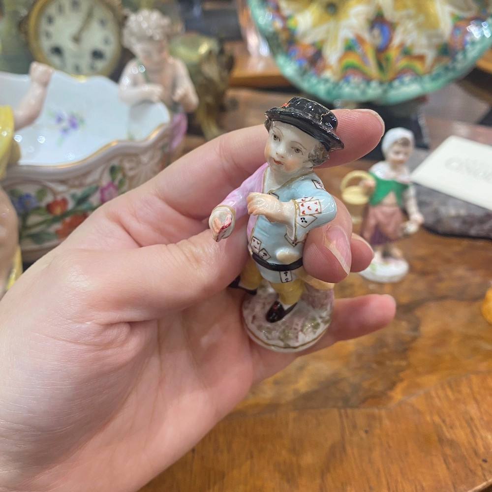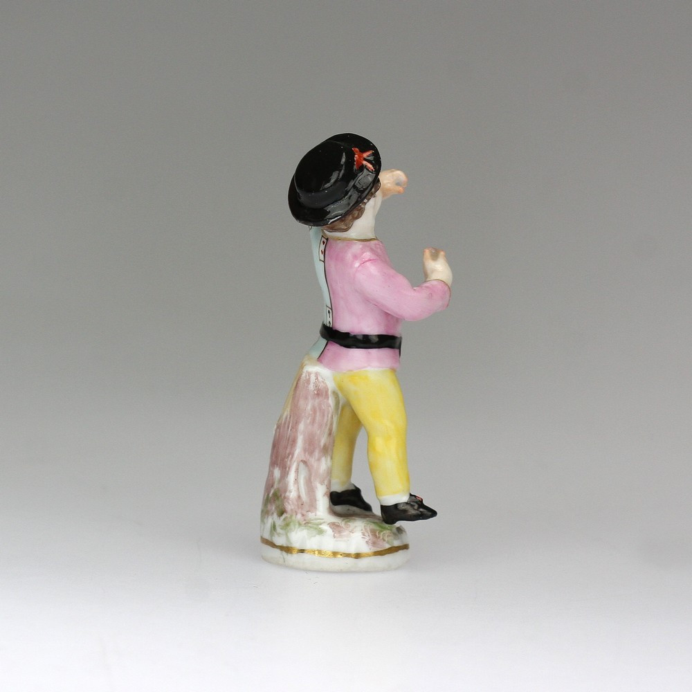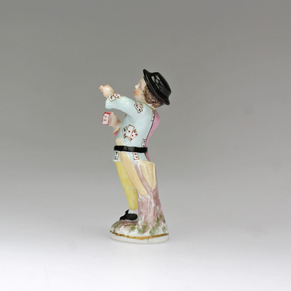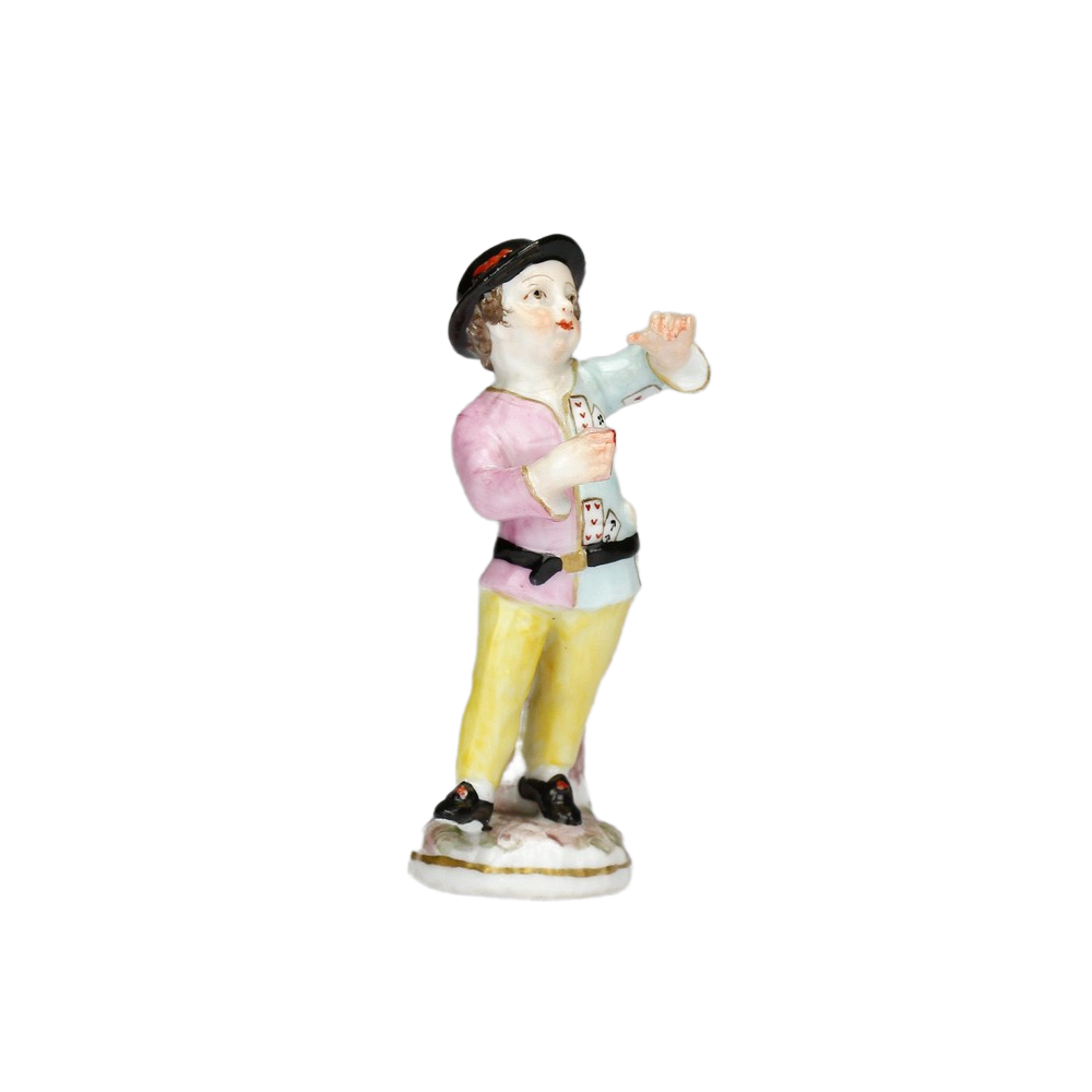 Porcelain figurine of a boy hiding a playing card in his hand; he also has a card motif on his clothing, so it is possible that this is an allegory of card games. Made in the Edmé Samson porcelain factory in Paris between the 1940s and 1960s. The work imitates older Meissen production from the 18th century.