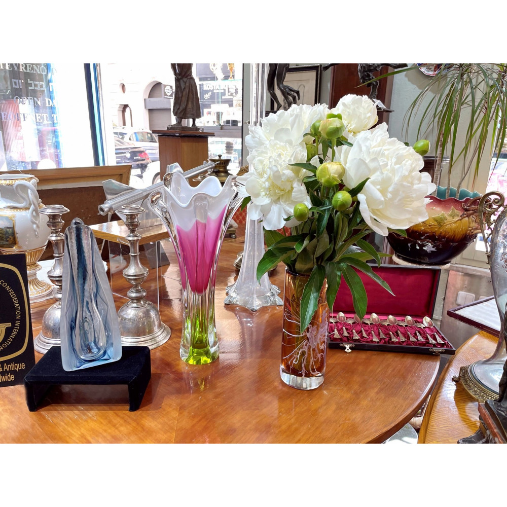 This massive glass vase is made using 2 layers of glass, whereby the inner layer has an amber shade and the outer layer is colourless. The vase comes from the Škrdlovice (Czechia) glass factory and the author is internationally recognized Czech glass designer Petr Hora, who was working for Škrdlovice between 1970s and 1990s.