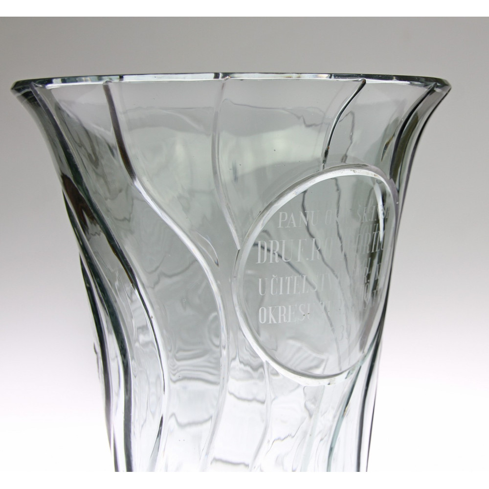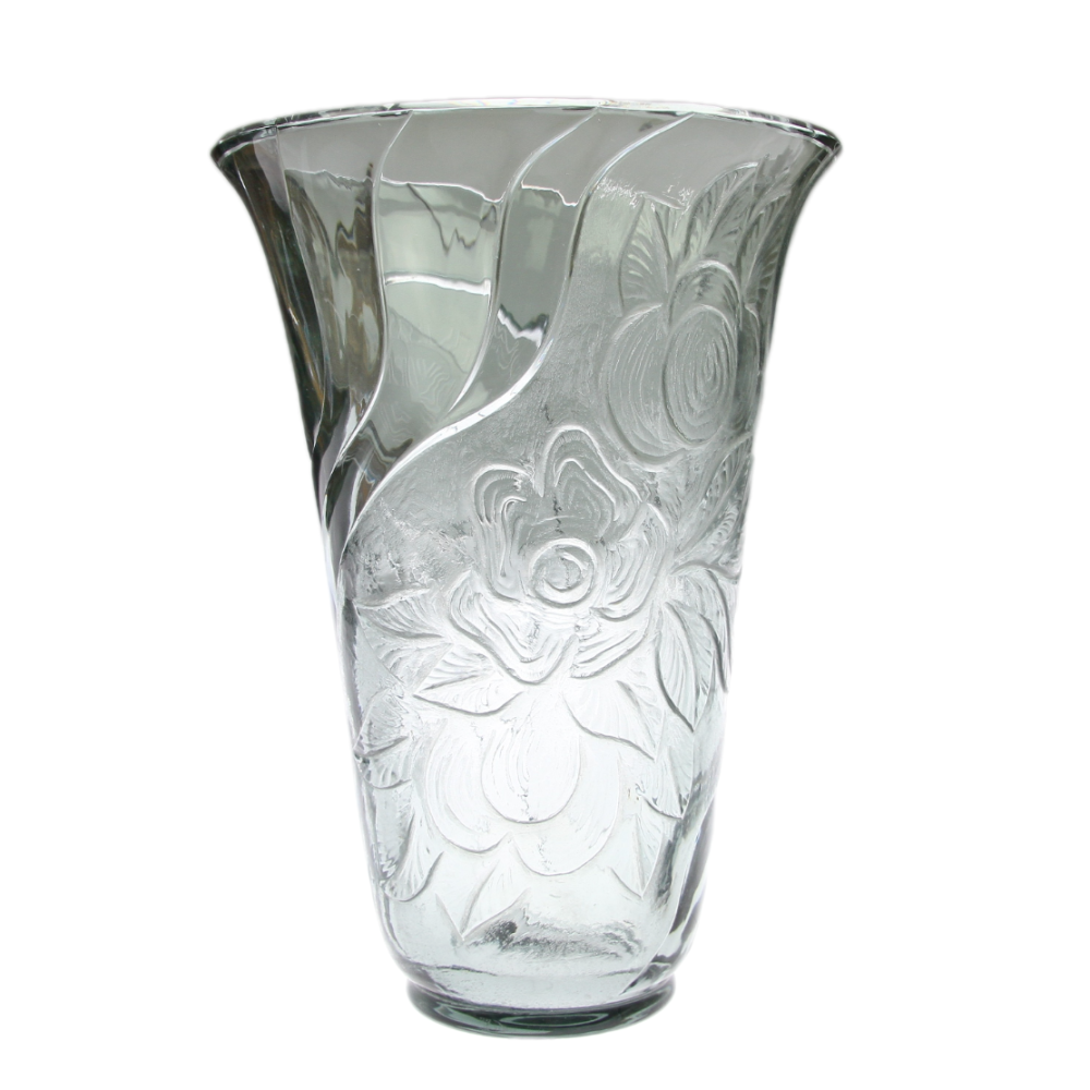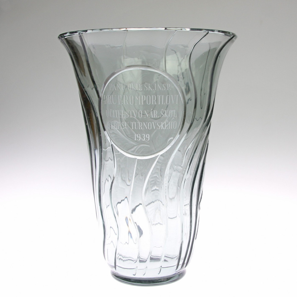 Heavy vase made of thick smoke glass of grey-green shade. Hand cut and polished with floral decoration on one side. On the other side, in a round frame, there is a dedication: 'PANU OKR. ŠK. INSP. DRU F.ROMPORTL UČISTVO NAR. ŠKOL. 1939'. Probably made in North Bohemia in Železný Brod. Timeless art deco design.