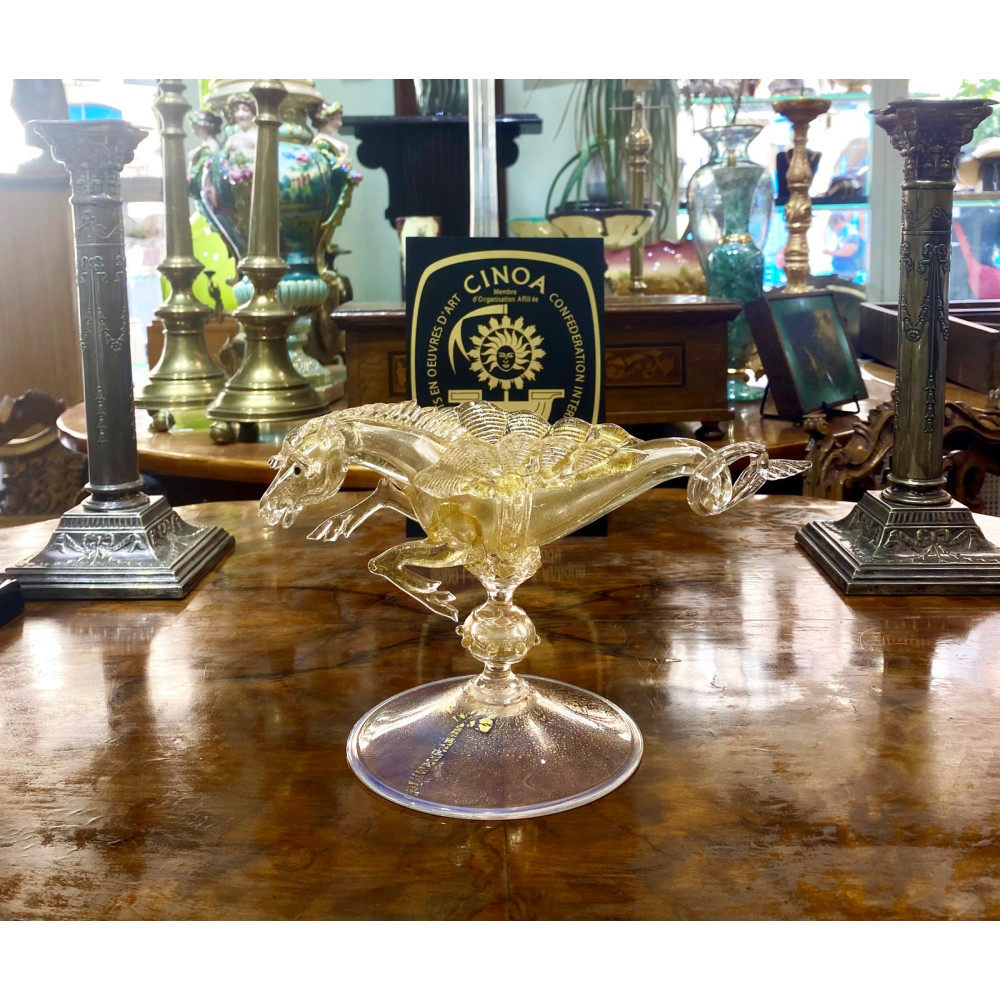 The glass sculpture on a foot with a round base comes from the 2nd half of the 19th century, probably from Harrachov. The decorative sculpture is made in the form of a sea horse, a mythical creature called hippocampus, which has the front half of the body of a horse and the back half of the body of a fish. Production inspired by the Italian Murano.