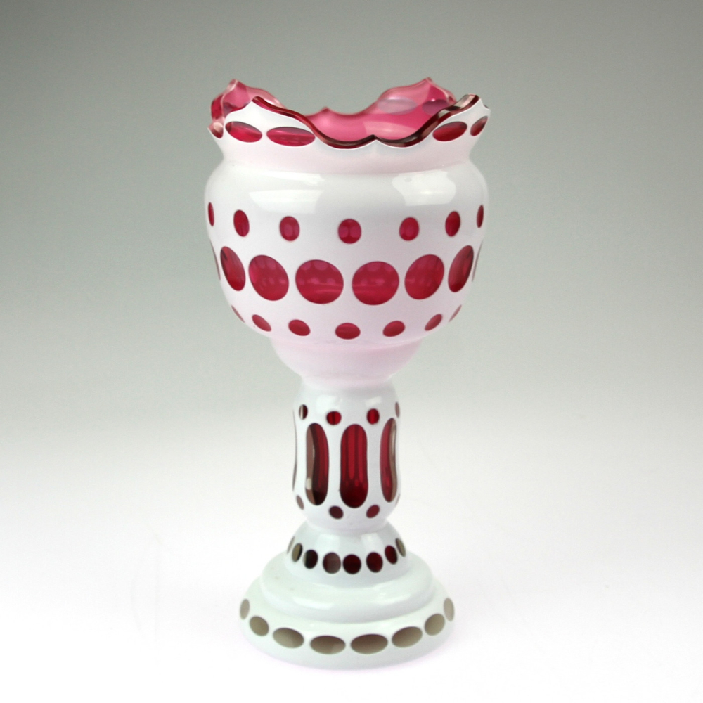 Vase dating from approximately the first quarter of the 20th century is made of layered clear and rosaline glass overlaid with brushed white enamel.
