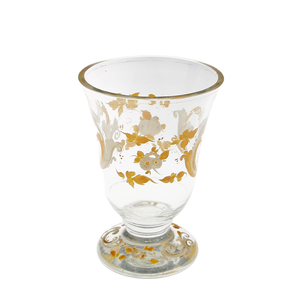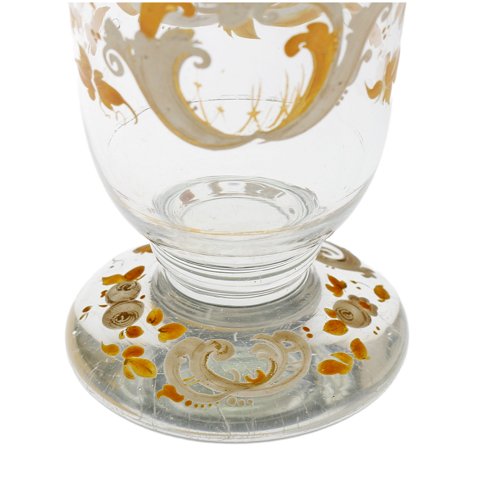 A goblet made of clear glass. The motif of roses and rocaille cartouches is hand-painted with white and ochre enamels and golden line (it is already wiped off in places). Probably Bohemian production from the middle of the 19th century.
