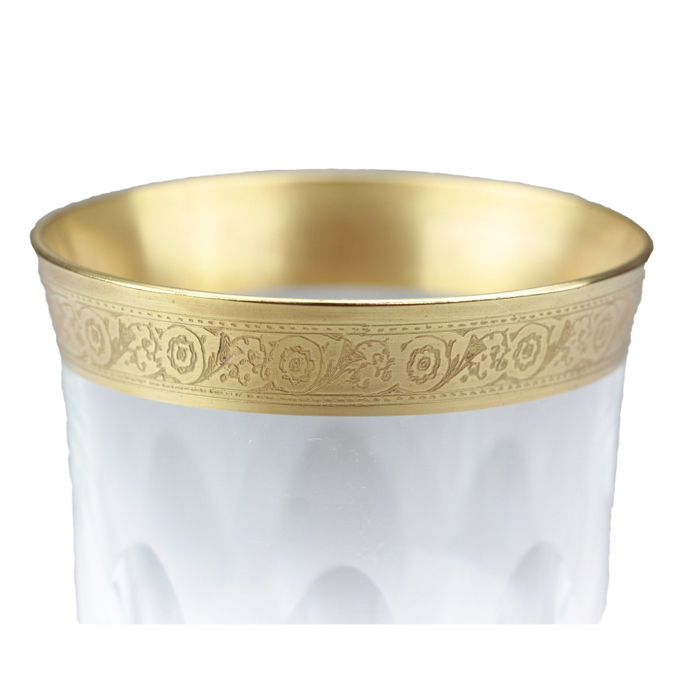 Set of 2 handmade stemmed glasses made of clear colorless glass (JESSIE collection), the upper part is decorated with a gold rim with an engraved ornament. The volume of the glass is approx. 50 ml.