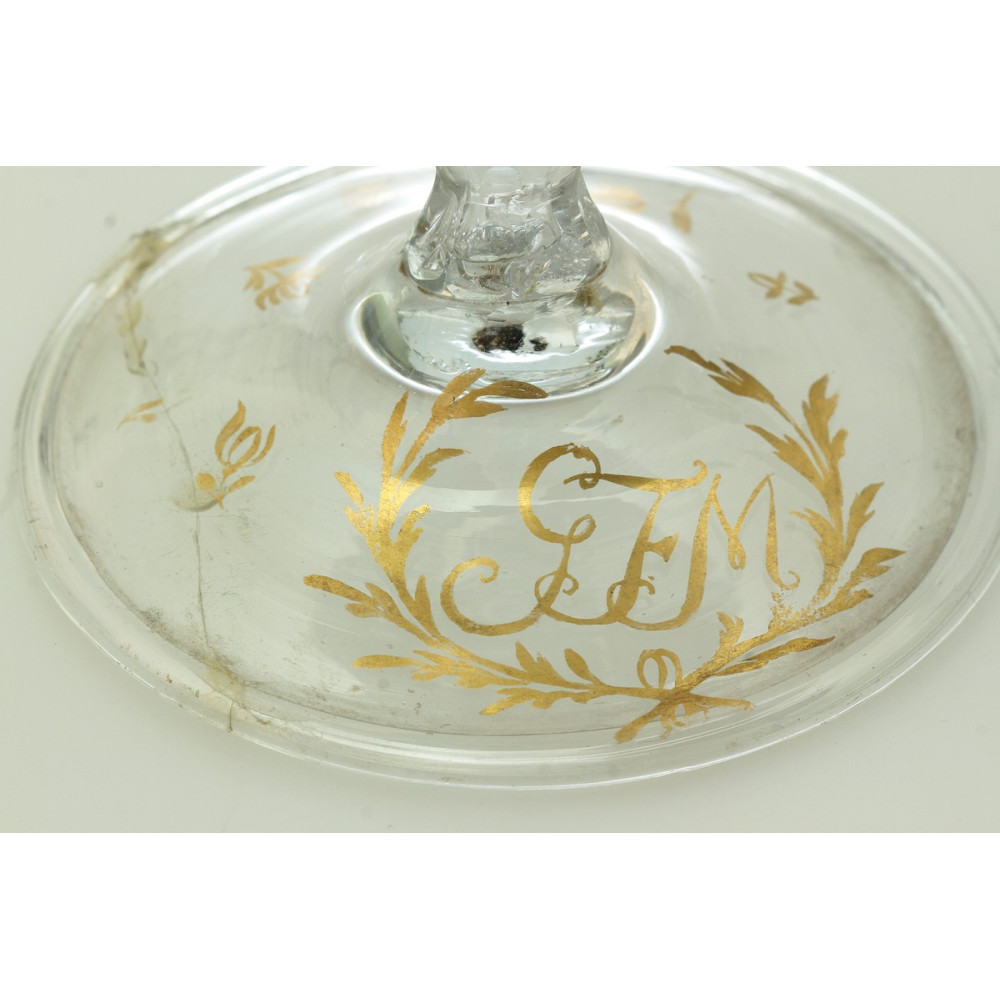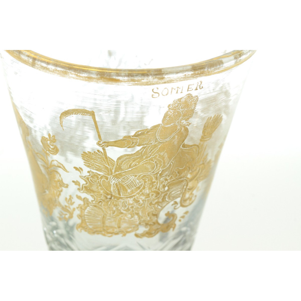 The flat circular base supporting the cut faceted stem is painted with gold and the monogram "SFM". Part of the base has two cracks that have been repaired in the past (see photo). The cup covers a scene of the four seasons in scratched gold. The lid is preserved in excellent condition and is also painted with gold.
