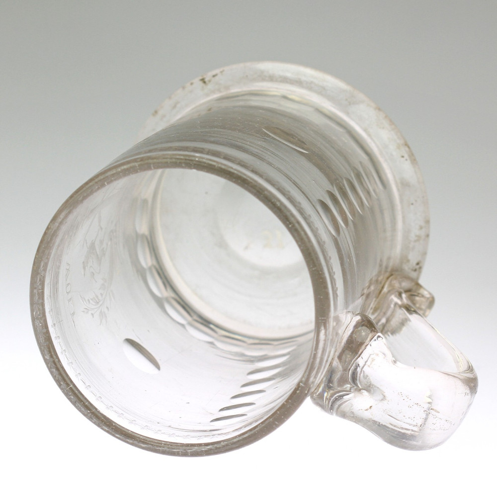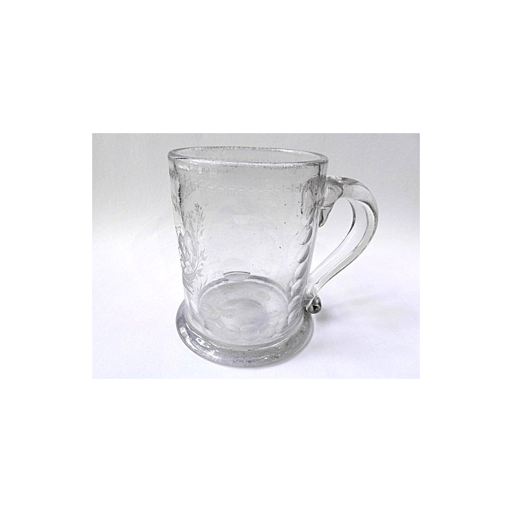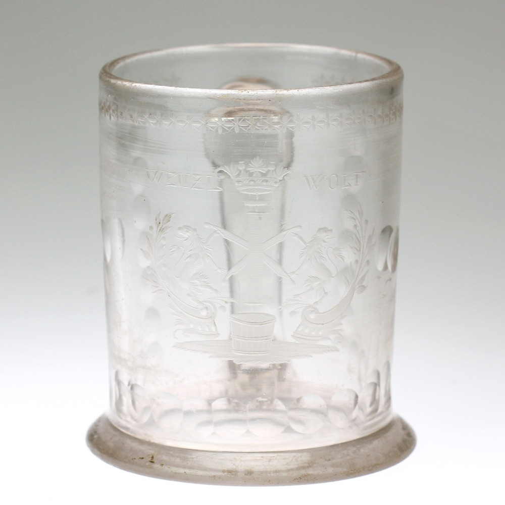Thick glass tankard with a metallurgical shaped handle made in the second half of the 18th century, probably in Bohemia. Decorated with cut decoration all over the surface. On the front is the detailed emblem of the tanners' guild with the name 'Wenzl Wolf', probably a commemorative gift.