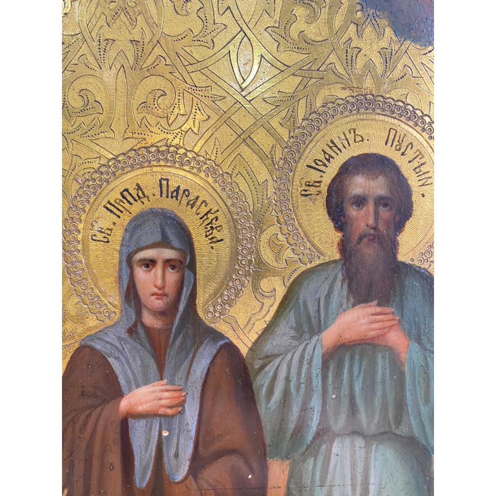 An icon painted in tempera on a wooden board, created in Russia at the turn of the 19th and 20th centuries. It depicts four saints: from left to right, Saint Paraskeva, Saint John, Saint Irene, and Saint Panteleimon. Above them, in the “open heaven,” Christ Pantokrator is shown seated on clouds. The background and the frame of the icon are richly decorated with ornamental motifs.