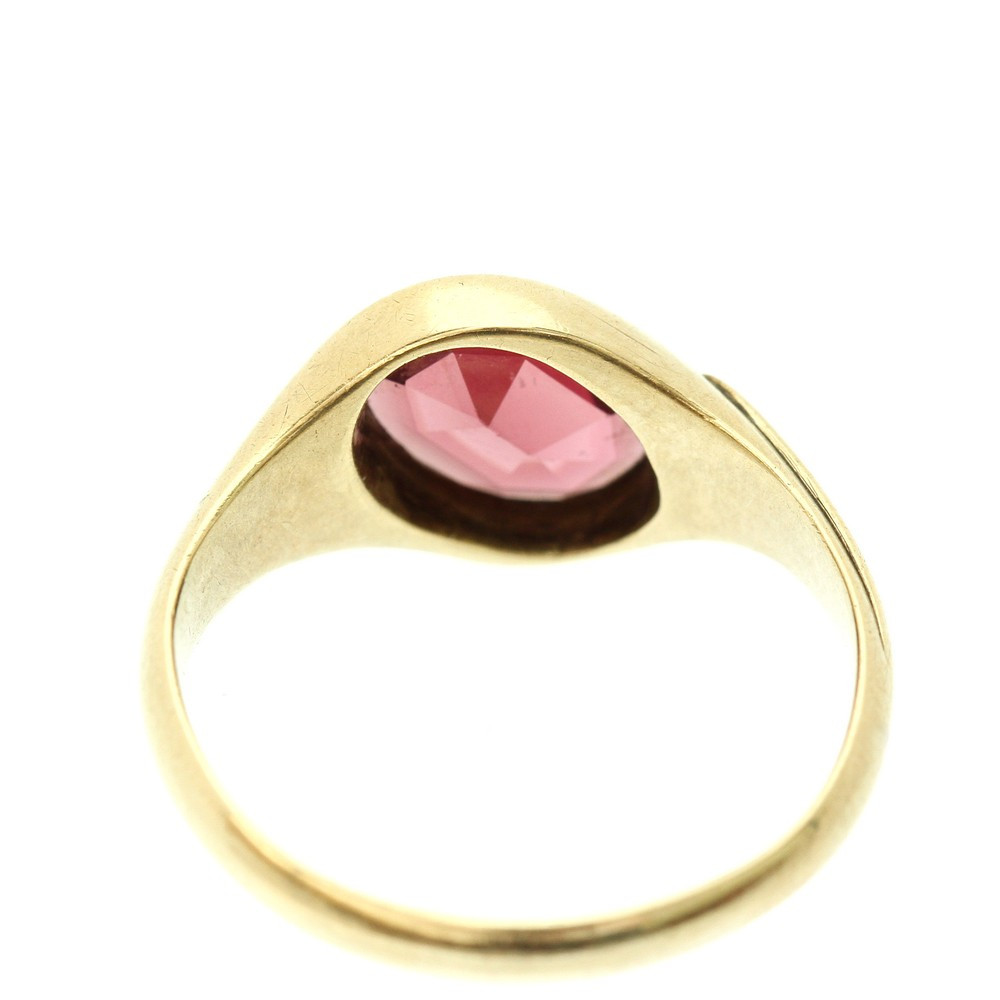 A ring crafted from light yellow 9.5k gold (Au 395/1000). The natural almandine, with a flat top—as is typical of signet rings—and a faceted bottom, is interestingly set diagonally relative to the band. On both sides of the ring, there is a decorative line running along the shank.