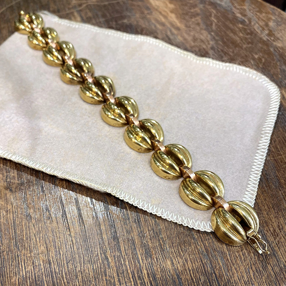 Classic art deco link bracelet made in the second half of the 1940s by the Karat goldsmiths' cooperative (founded 8.6.1946 in Brno). Made of 14k yellow gold. Marked with the hallmark "lion" used in Czechoslovakia between 1929-1949, the purity number and the letter "K" (Karat).
