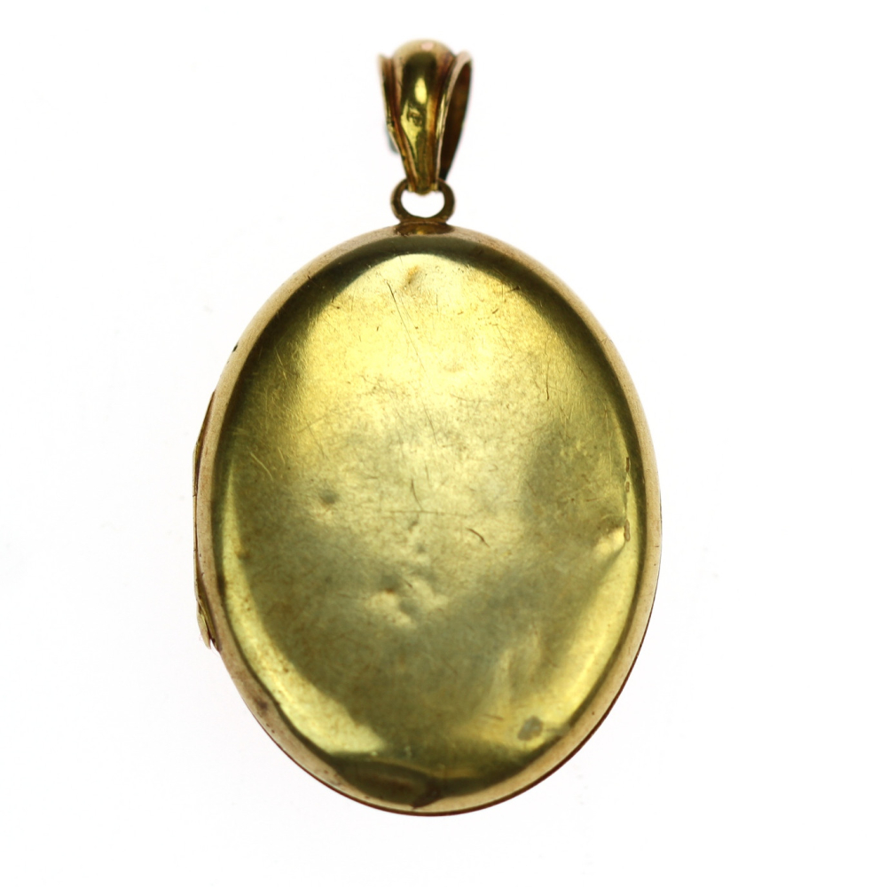 Oval locket dating from the last quarter of the 19th century with the place of hallmarking in Vienna. The material is 14k rose gold (fineness 580/1000), which is also heavily gilded with yellow gold. The front case features an applique of the "A" initial, which is set with 19 natural rose cut diamonds. Inside the pendant there is space for two photographs...