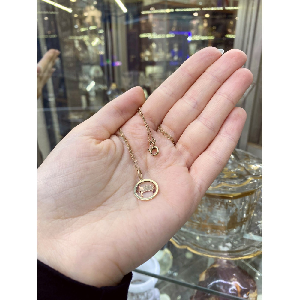 Chain and pendant made of 14k yellow gold. The Aries sign in the pendant is made of rose gold. Both pieces are marked with the hallmark used in the 2nd half of the 20th century.