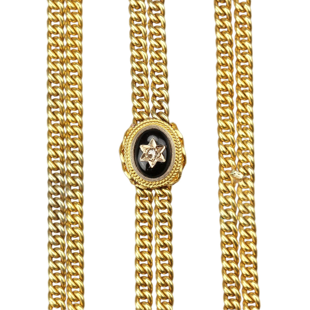 A 154 cm long walis chain with a carabiner at one end, formerly used for suspending a pocket watch or lorgnette. The slider is decorated on both sides with black enamel and a central gold star. Crafted in yellow 14k gold with a rose gold screw carabiner.