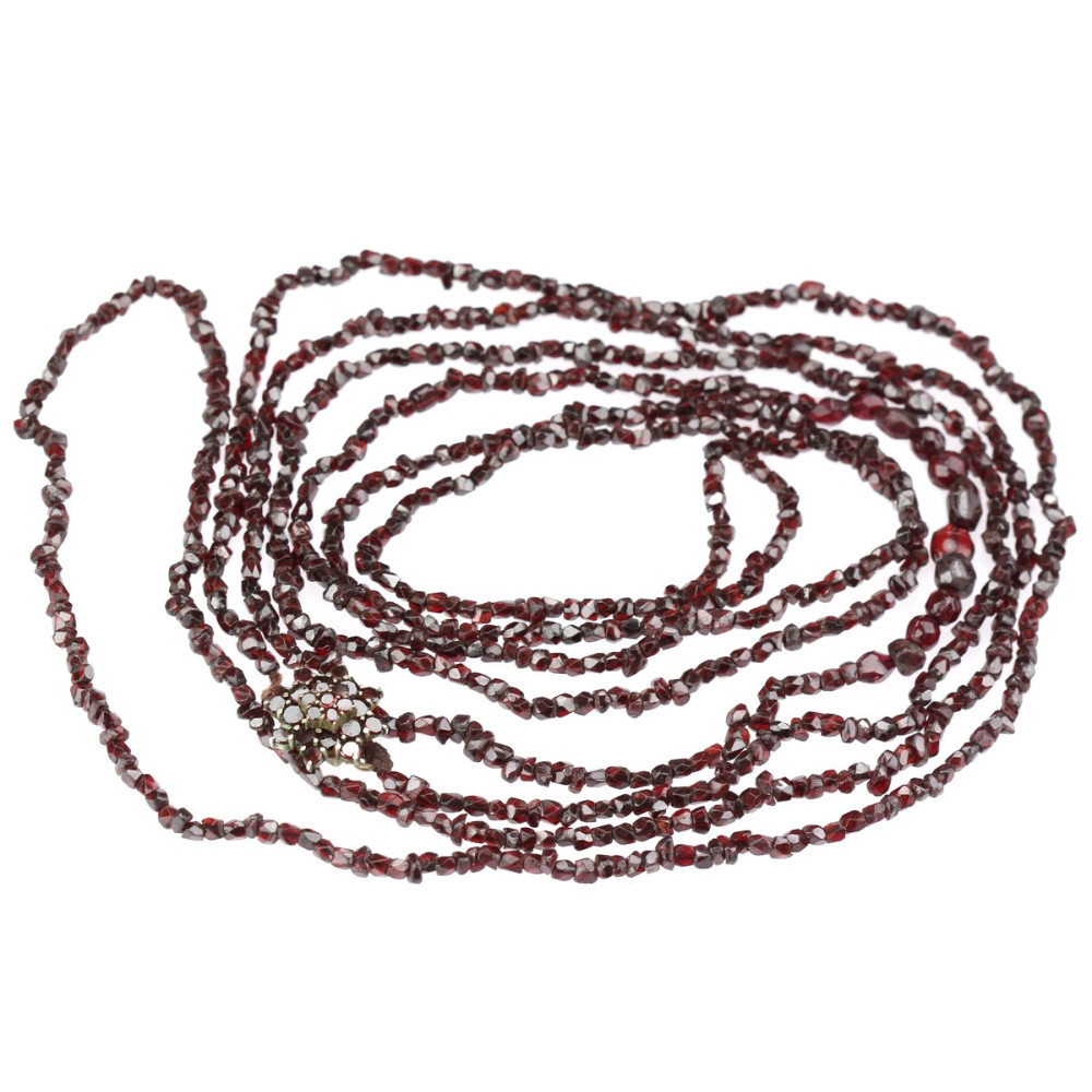 Long string of natural garnet beads of various types and sizes. The base metal clasp is set with flat-cut garnets.