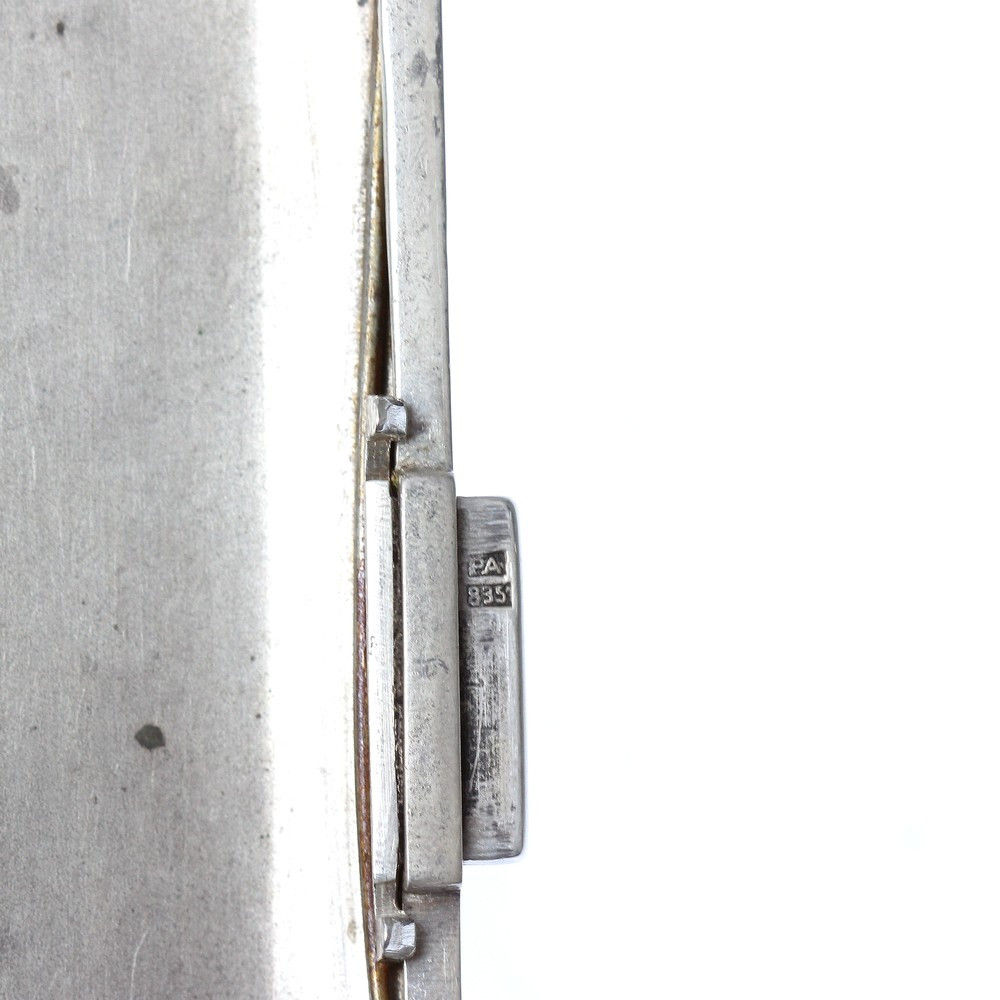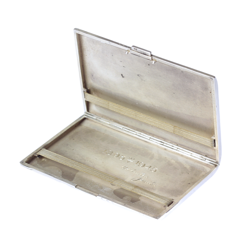 An elegant cigarette case made in Czechoslovakia, probably in the 1940s, from 835/1000 silver. Inside is a hand-engraved dedication: "1895 24/V 1945 Od bratra Jeníka" (from brother Jeník). Stamped with a fineness number, maker's mark and Czechoslovak export mark. The fineness of the metal is confirmed by a certificate from the Czech Assay Office.