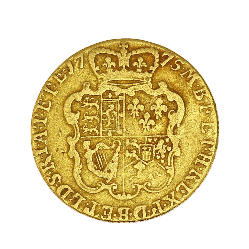 Gold coin depicts the British King George III. The material is gold with a fineness of Au 917/1000. On its obverse side there is the inscription: 'GEORGIVS.III DEI.GRATIA'. On the reverse side is a crowned coat of arms, with the year of mintage 1775 and the inscription: 'M. B. F. ET. H. REX. F. D. B. ET. L. D. S. R. I. A. T. ET. E.'.