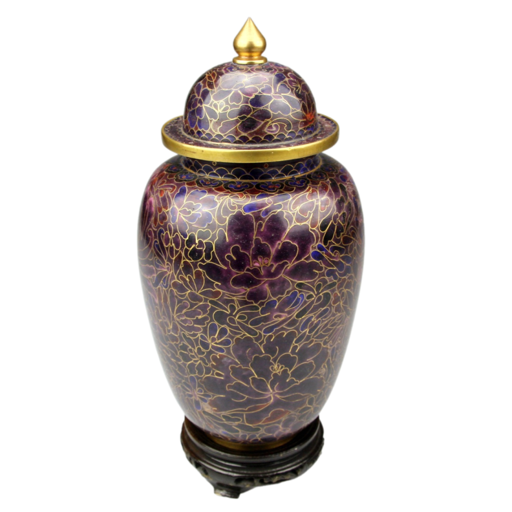 Larger (29 cm) brass ginger jar. Almost the entire surface is covered with cloisonné enamel with a peony motif in the centre. The inner walls are covered with light blue enamel. This is one of the traditional techniques used in China for more than 600 years.