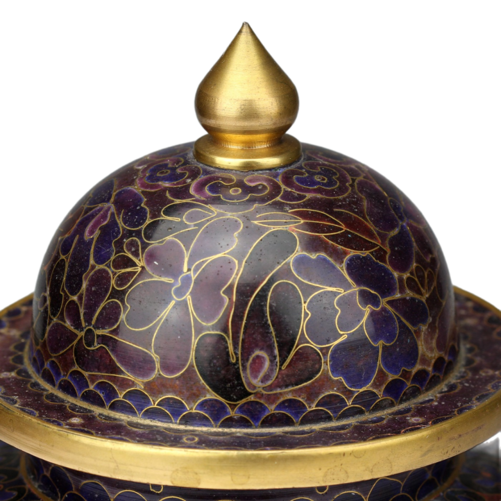 The 8 cm high cointainer is richly decorated with coloured cloisonne enamel on brass. This is one of the traditional techniques used in China for more than 600 years.