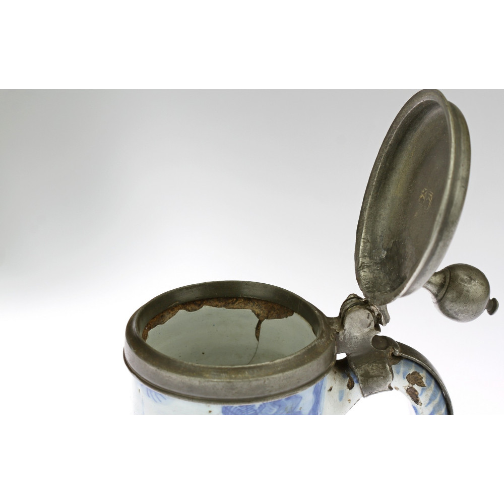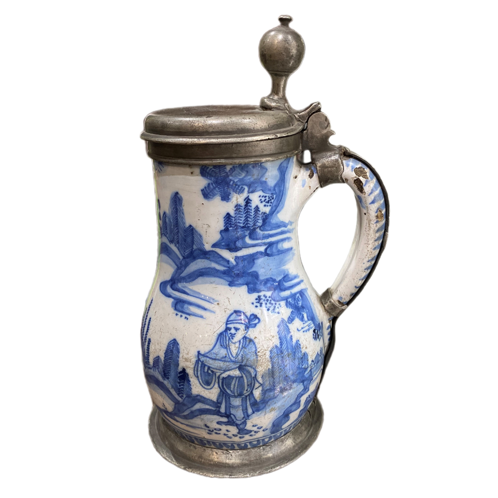 The pear-shaped corbel is made of blue and white faience with chinoiserie motifs. The lid and the edges of the object are made of tin, which is marked with the engraved date ‘1748’ and the monogram ‘CS’. Similar corbels come from Delft or Frankfurt production.