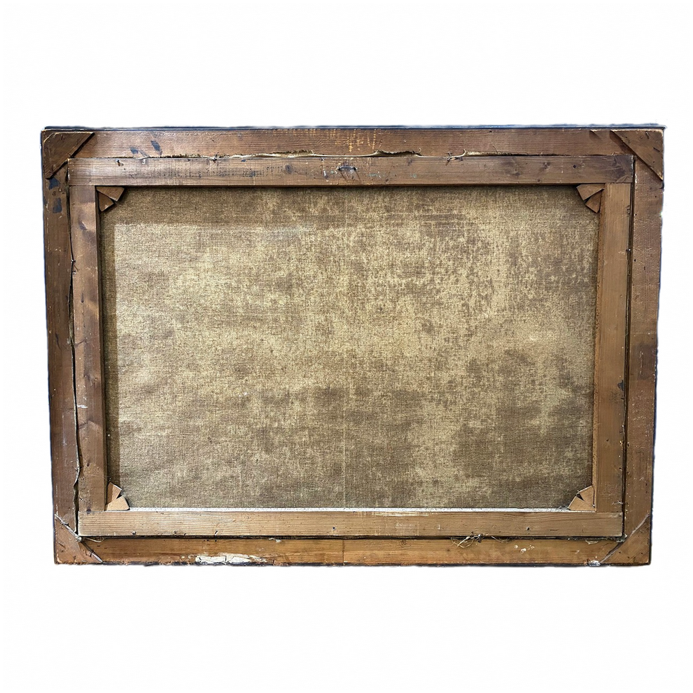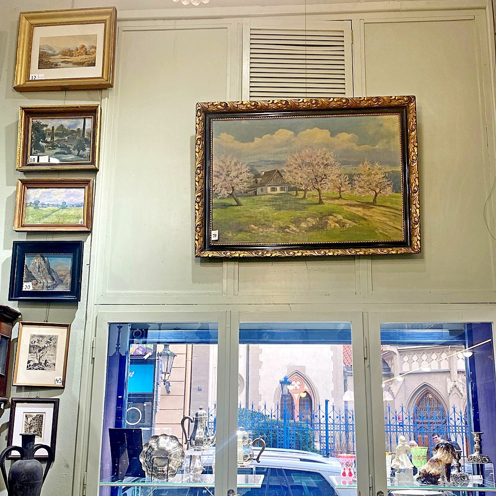 This large-format painting depicts a landscape with a rural building and blossoming apple trees. The artwork is executed in oil on canvas and signed “A. Licht” in the lower right corner (Alfréd Licht). The piece is set in its original frame.
