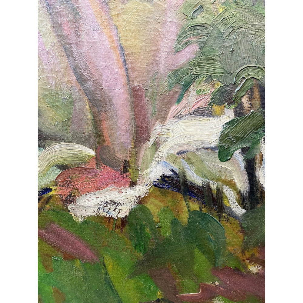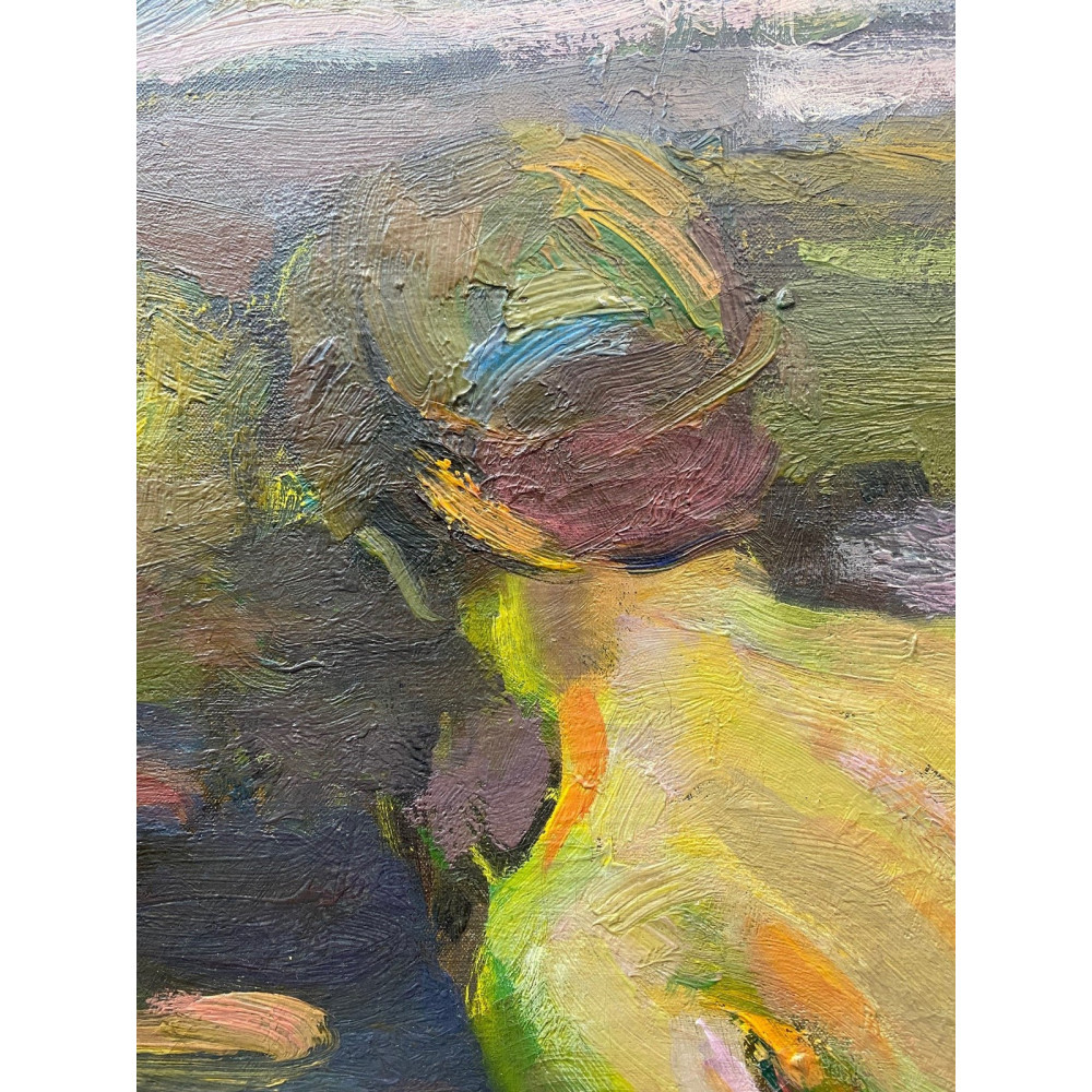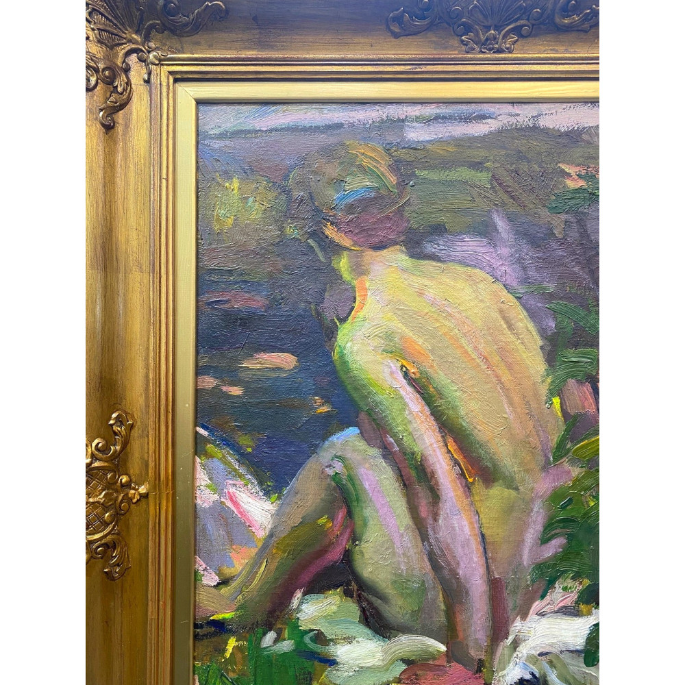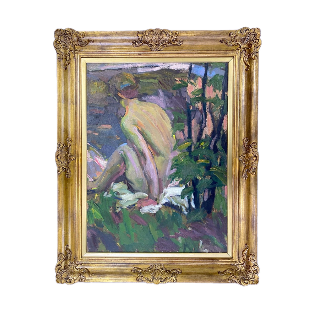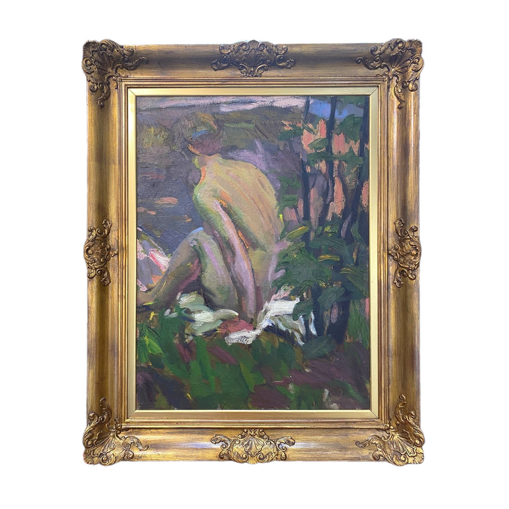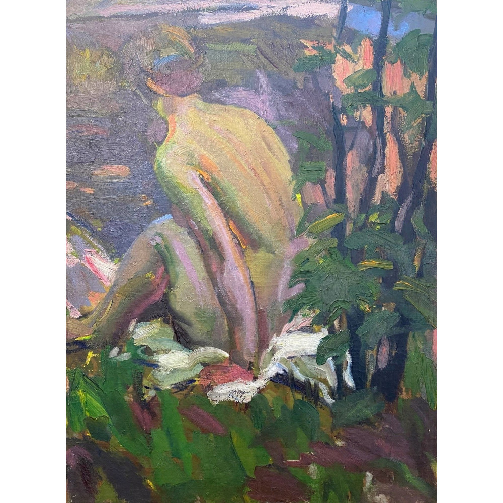 This oil painting on canvas from 1910–1915 depicts a female figure sitting with her back to the viewer by the water's edge, set against a backdrop of lush vegetation. The composition is built up using areas of color and a relaxed brushwork typical of the post-impressionist style of the early 20th century. The impasto technique with visible brushstrokes emphasizes the light atmosphere rather than detailed drawing. The color scheme is based on a harmony of green, ochre, and muted purple tones.