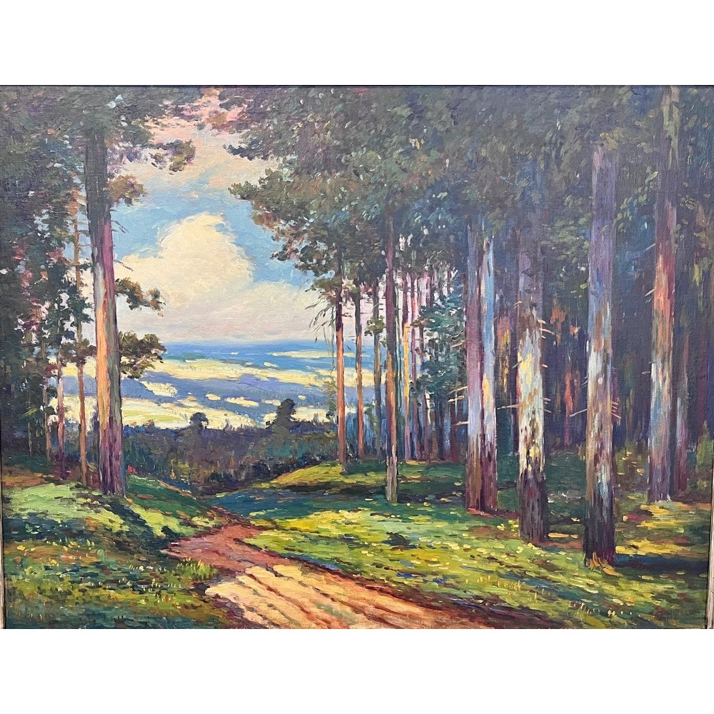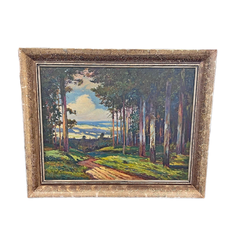 This large-format painting with a summery atmosphere depicts a sunlit forest path and a view of the countryside. The painting is executed in oil on canvas and is signed “J. Steinský” (Josef Steinský, born in 1903) in the lower right corner. Framed.