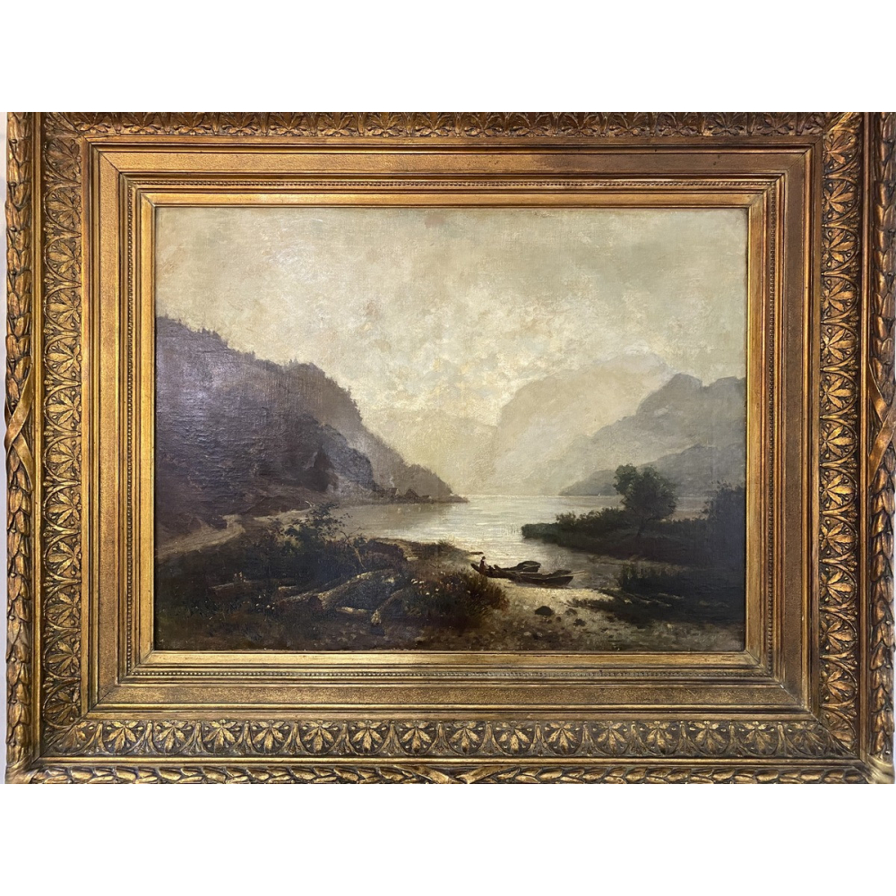 A picture painted with oil on board by a french Barbizon school painter Hippolite Delpy. The image shows the landscape at dawn. Framed with a very plastic wood, gilded frame.